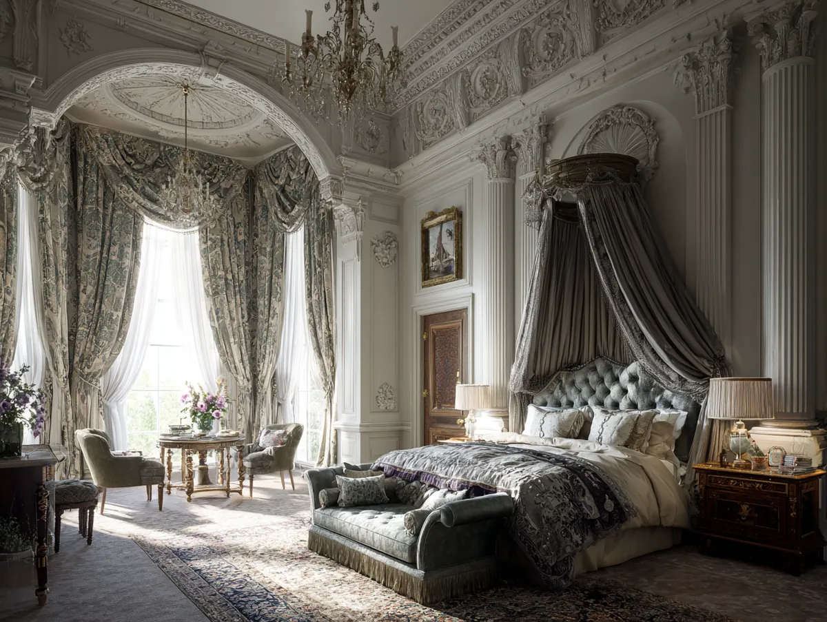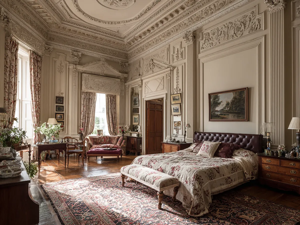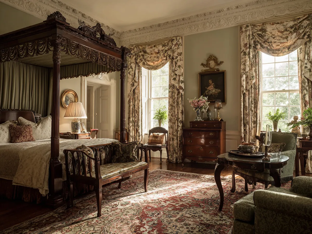 Grandeur in Georgian bedroom decor is achieved through a combination of architectural elements, furnishings, and decorative accents. High ceilings, often adorned with intricate moldings and plasterwork, set the stage for a bedroom that feels both spacious and regal. Large windows, draped with luxurious curtains, allow natural light to flood the room, enhancing its spaciousness.
