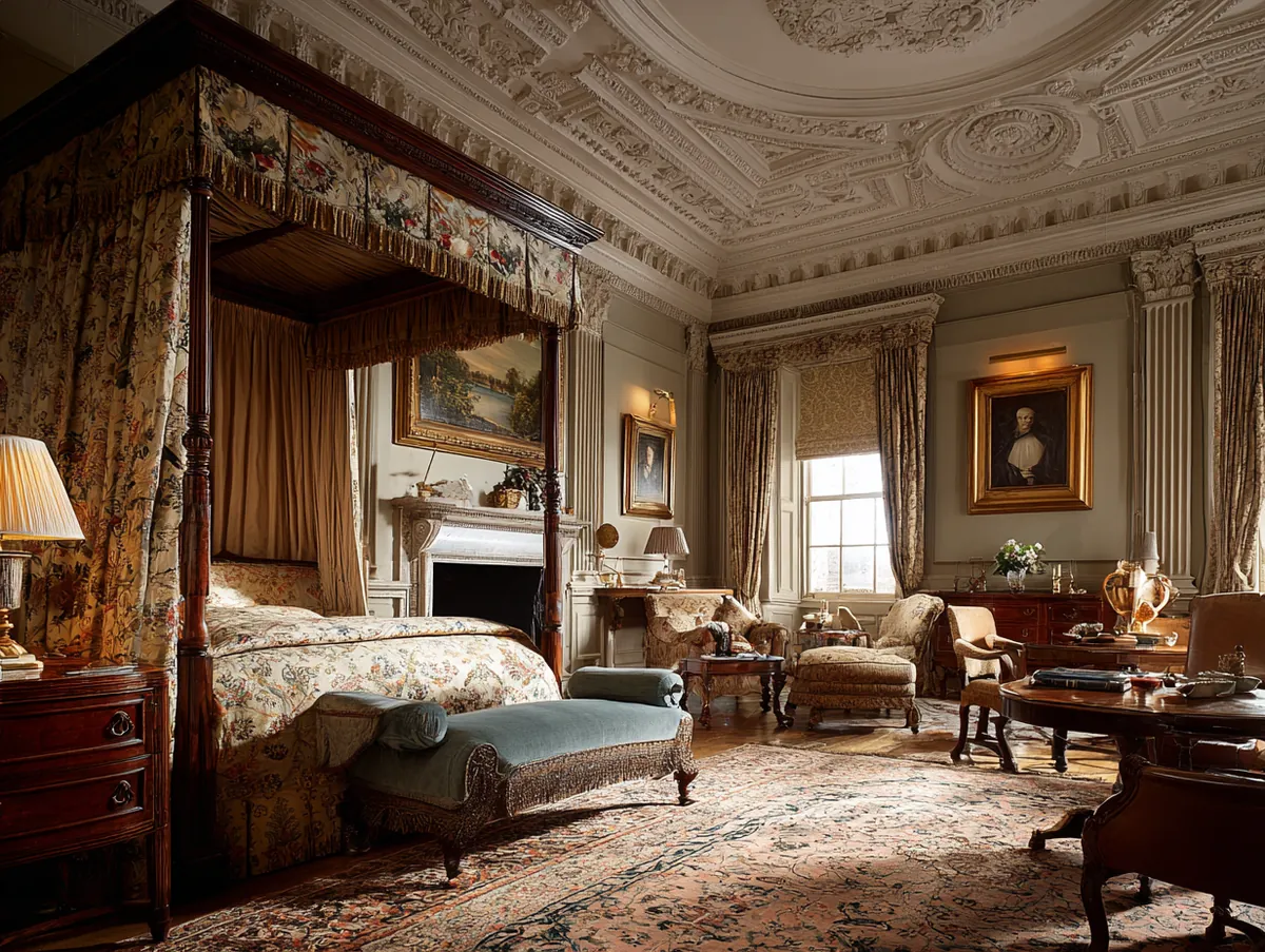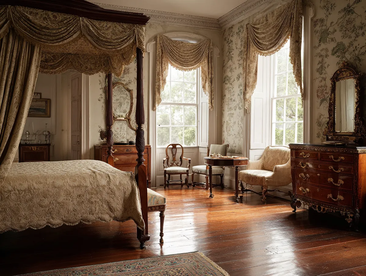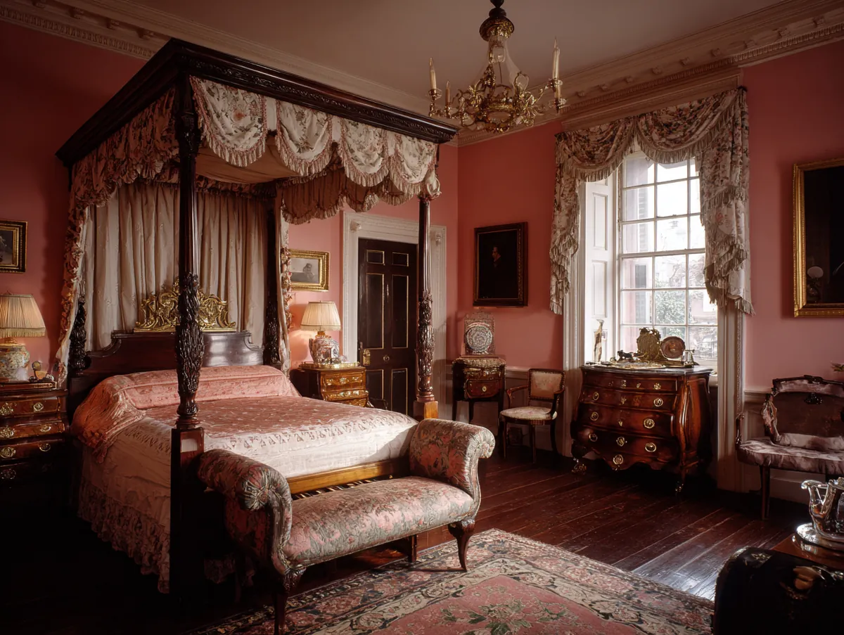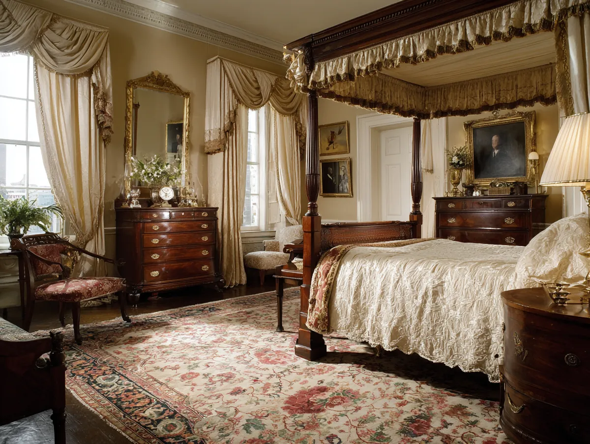Seating options in Georgian bedrooms were equally elegant. Chaise lounges, upholstered in rich fabrics, provided a comfortable spot to relax, while ornate chairs, often featuring carved legs and backrests, added to the room’s aesthetic appeal.
