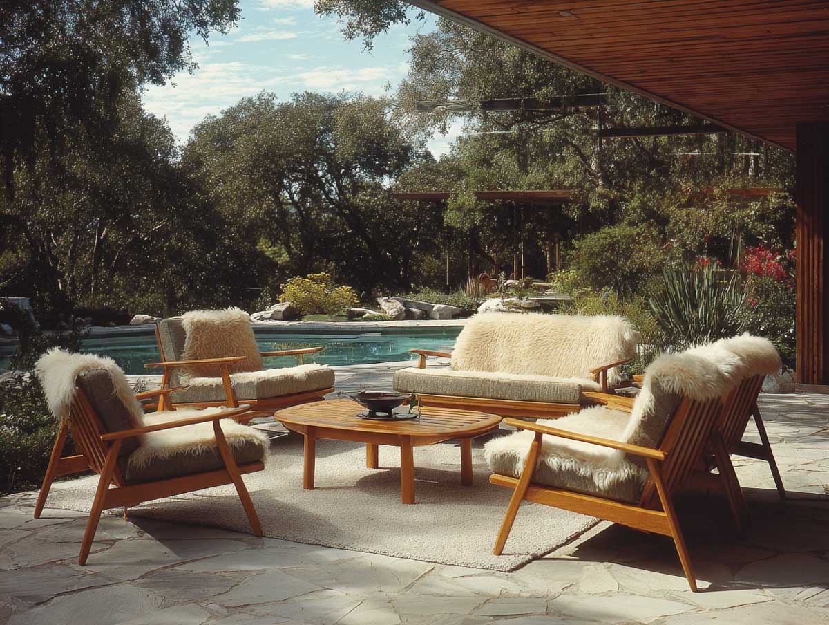 A hallmark of mid-century outdoor design is the sleek, poolside layout—low, wide loungers in rich teak positioned to soak up the sun and appreciate surrounding geometry. Here, the furniture takes center stage without overpowering the setting. The focus is on crisp lines, subtle curves, and intentional placement that mirrors the shape of the pool and enhances the architectural flow of the patio.