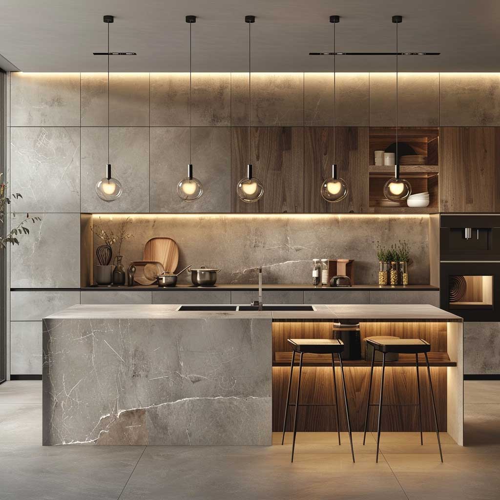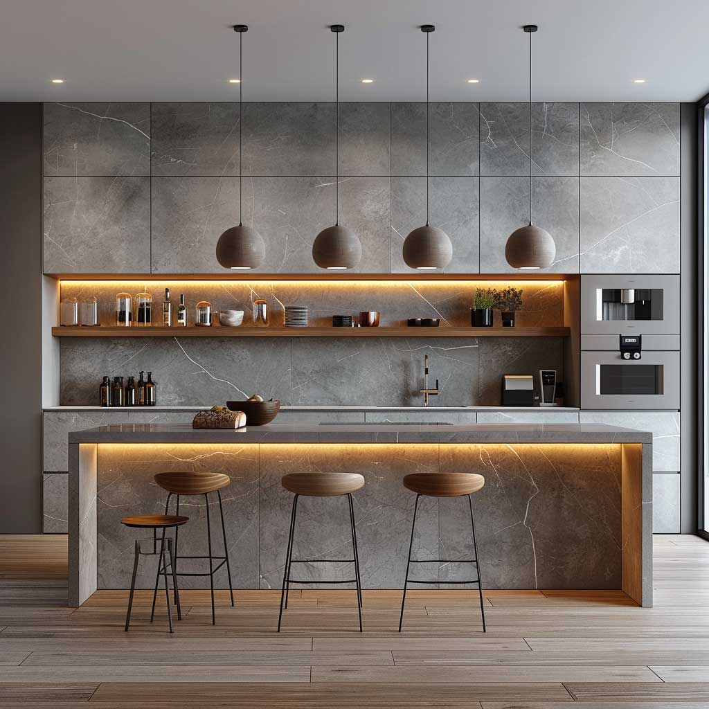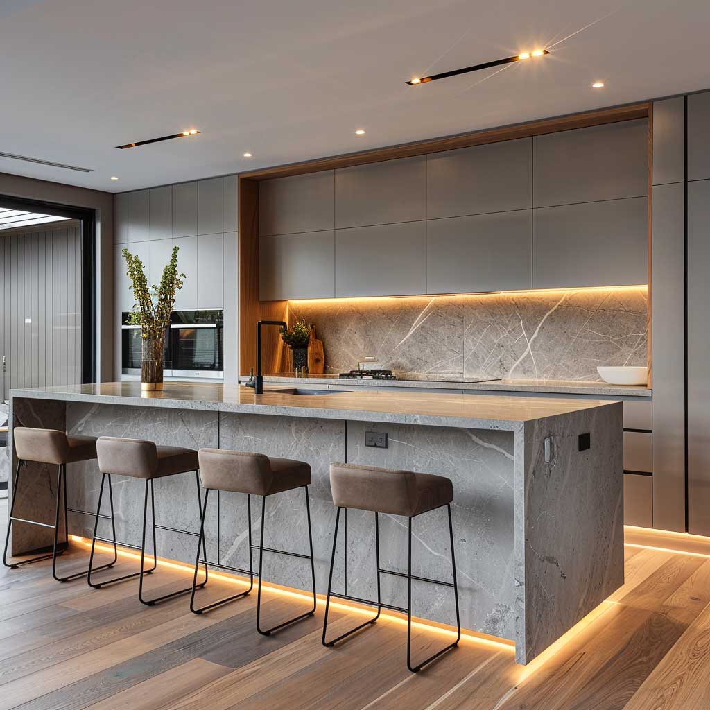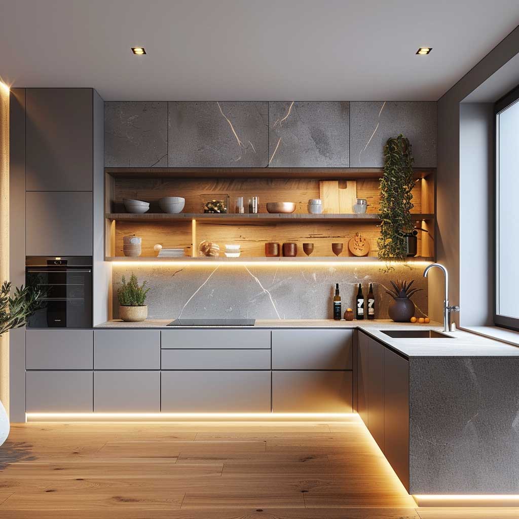Color schemes tend to lean towards whites and greys, which serve to amplify the natural light within the room. Strategic placement of LED lighting under cabinets not only enhances functionality but also adds to the ambiance, creating a cozy yet modern feel. A singular piece of art or a vibrant plant can serve as a focal point, injecting personality and life into the space without overwhelming it with visual clutter.
