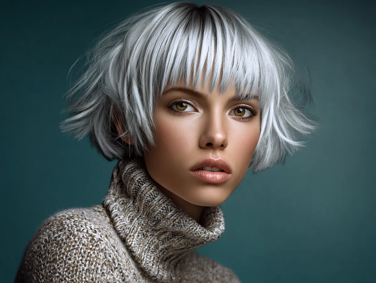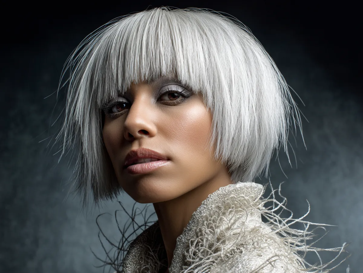 The icy silver shade amplifies every angle and dimension within the cut. Its reflective nature casts subtle shadows and shines that shift with movement. This is particularly effective on a choppy bob, where every flicked or feathered layer benefits from light manipulation. It adds visual intrigue and a sense of elegance without being overly dramatic.