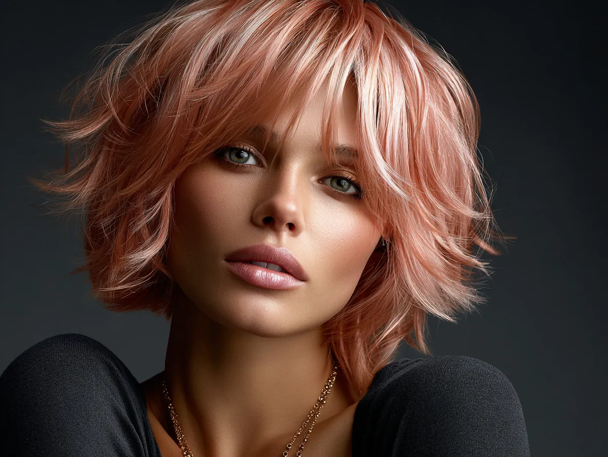 The tapered layers start around the temples and gently cascade down to a slightly elongated front. This shape widens the visual plane across the mid-face, where diamond features are most prominent. Instead of boxing in the cheekbones, the choppy bob uses movement and flow to frame them. The peachy undertones of the hair color reflect light in a way that lifts the face and makes the cut feel weightless.