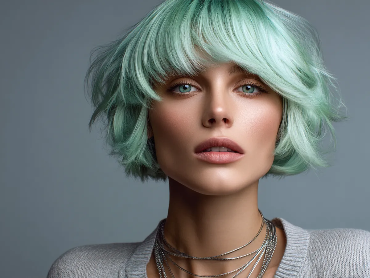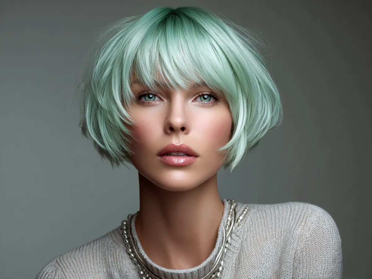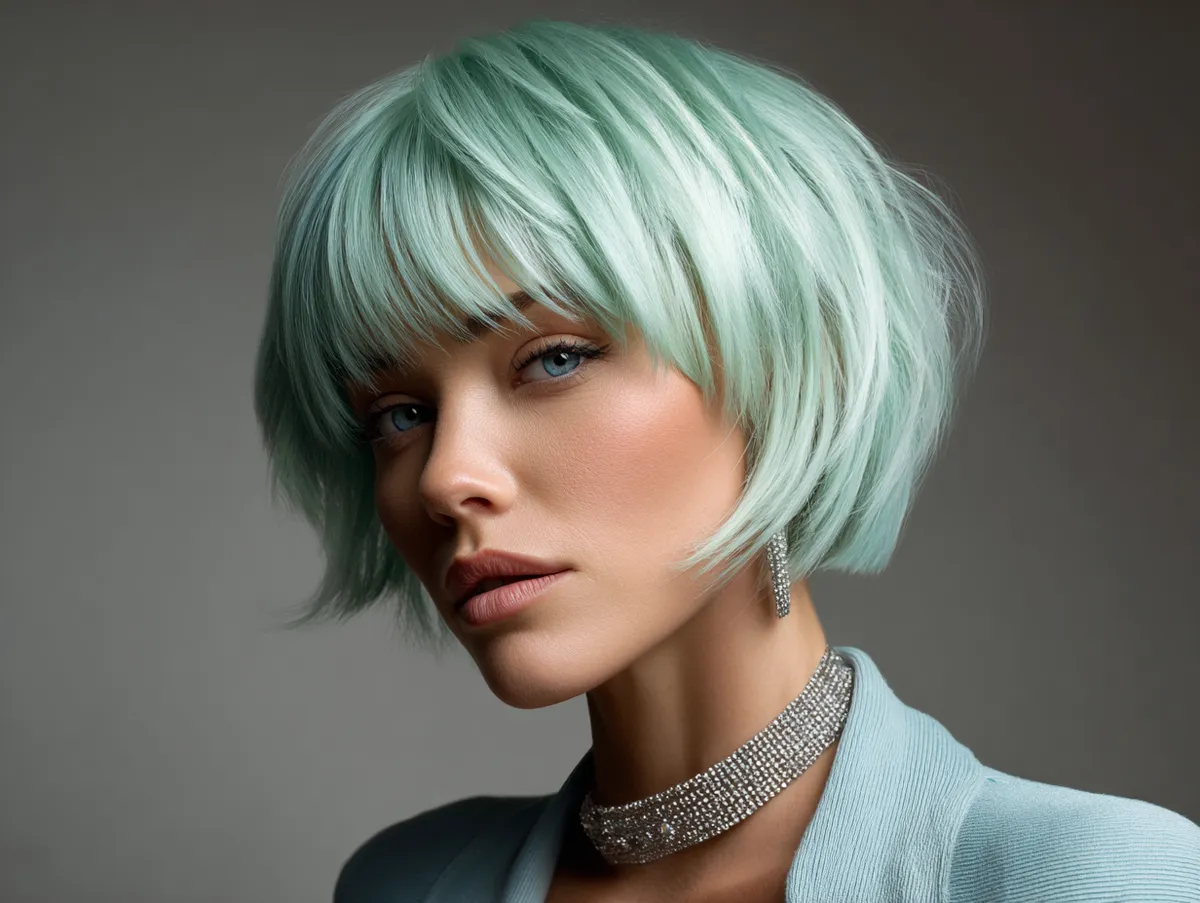 The cut starts at chin length and builds upward with short interior layers that provide natural lift. A side part works best for this face shape, allowing the bangs to cross the forehead diagonally and visually widen the upper portion of the face. The mint green tone, light and reflective, catches shadows along the cheekbones and adds lightness to the overall structure.