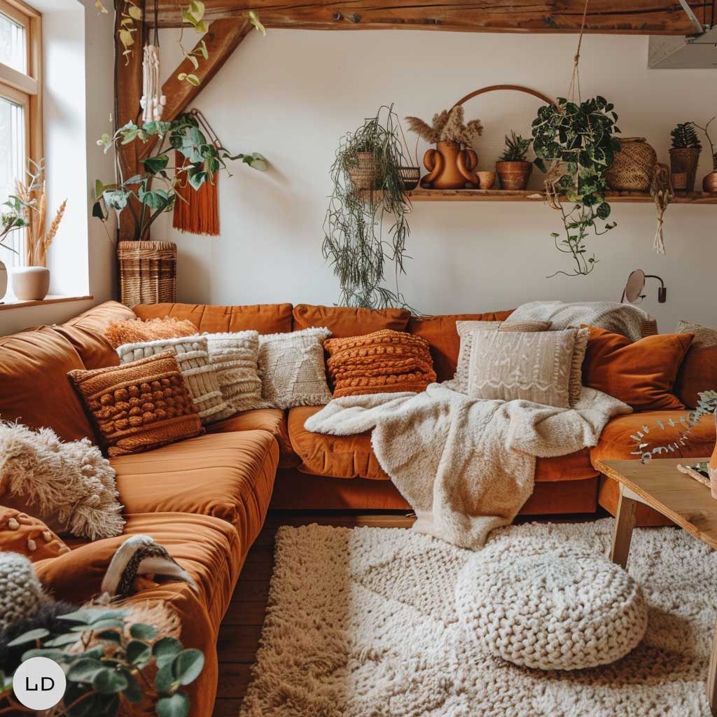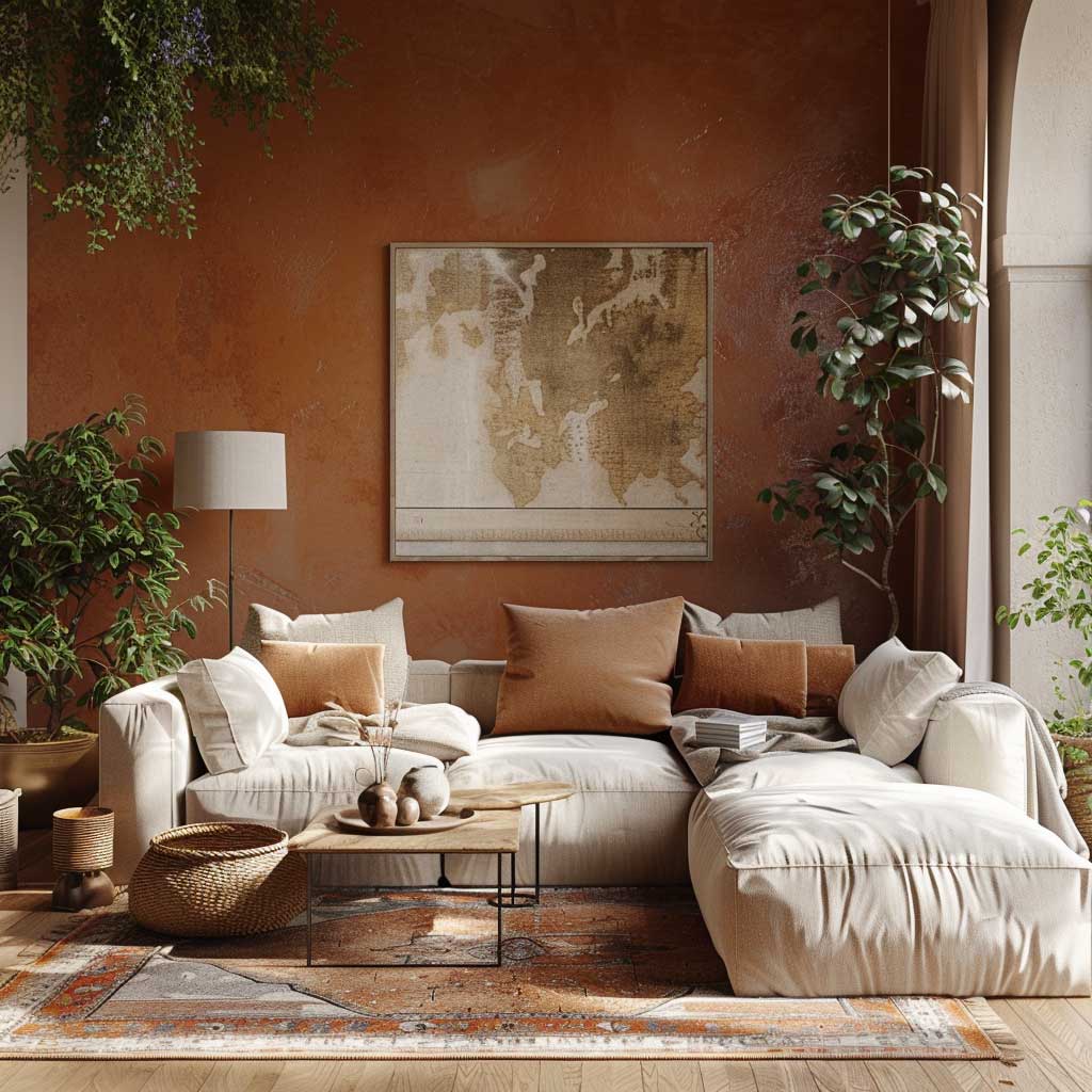 Imagine stepping into a living room where the walls are painted in rich terracotta, a color that evokes the warmth of the earth under the golden hour sun. This color doesn’t just adorn the walls; it wraps the room in a comforting embrace, setting the stage for a space designed for relaxation and connection. The choice of terracotta is intentional, drawing on its earthy tones to foster a sense of grounding and stability.