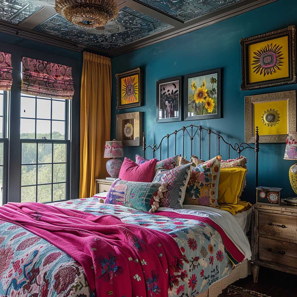 Visualize stepping into a bedroom that defies convention at every turn. The walls, adorned with vibrant teal, serve as the canvas for this artistic endeavor. Teal, a color that balances the calming properties of blue with the rejuvenation of green, injects a sense of dynamism and depth into the room. Its boldness is not overwhelming but inviting, creating a backdrop that encourages further creativity and expression.
