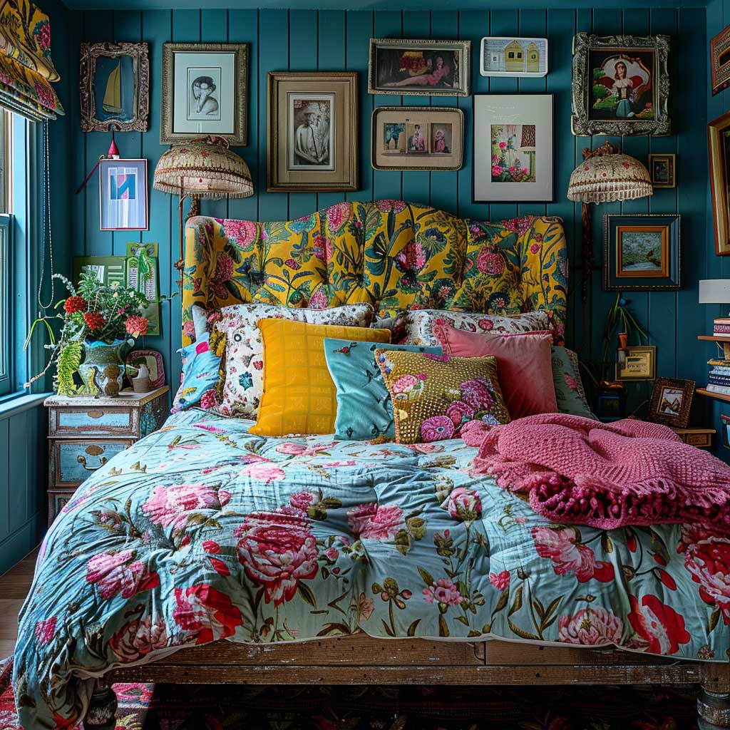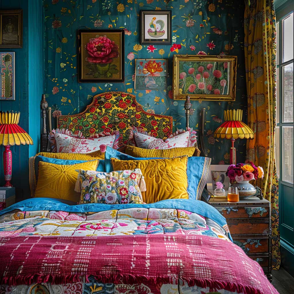 This eclectic mix of colors is further enriched by a careful curation of patterns and textures. Wallpaper becomes a piece of art in itself, featuring intricate designs that draw the eye and invite conversation. Bedding in a mix-and-match fashion breaks all the ‘rules’, combining different patterns and colors in a way that feels both harmonious and intentionally dissonant. Eclectic decor pieces, each with its own story, dot the space, creating a sense of discovery and wonder.