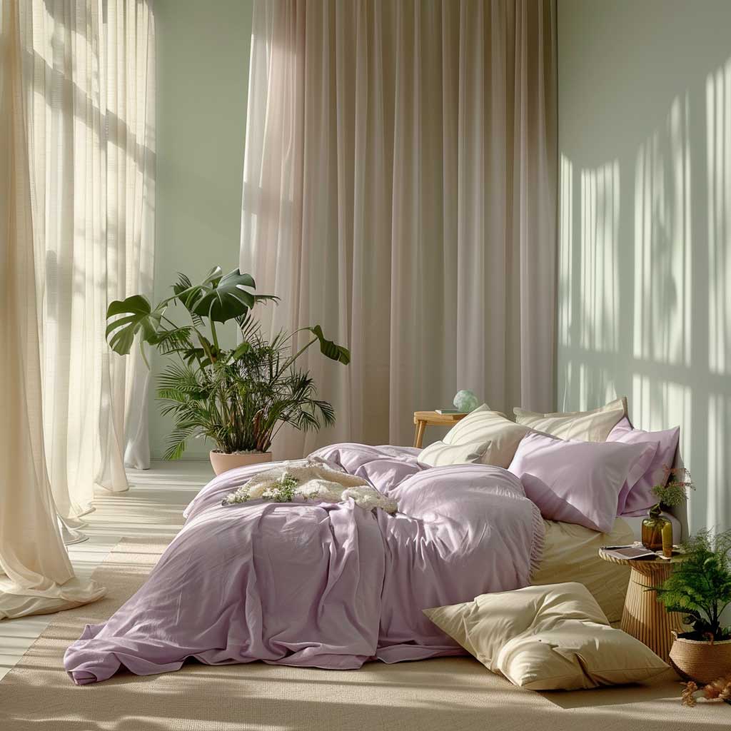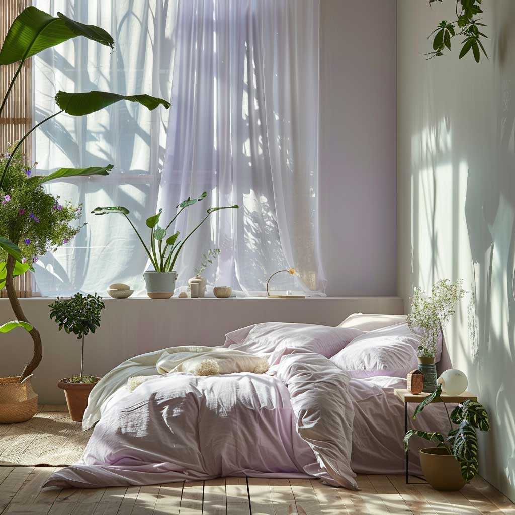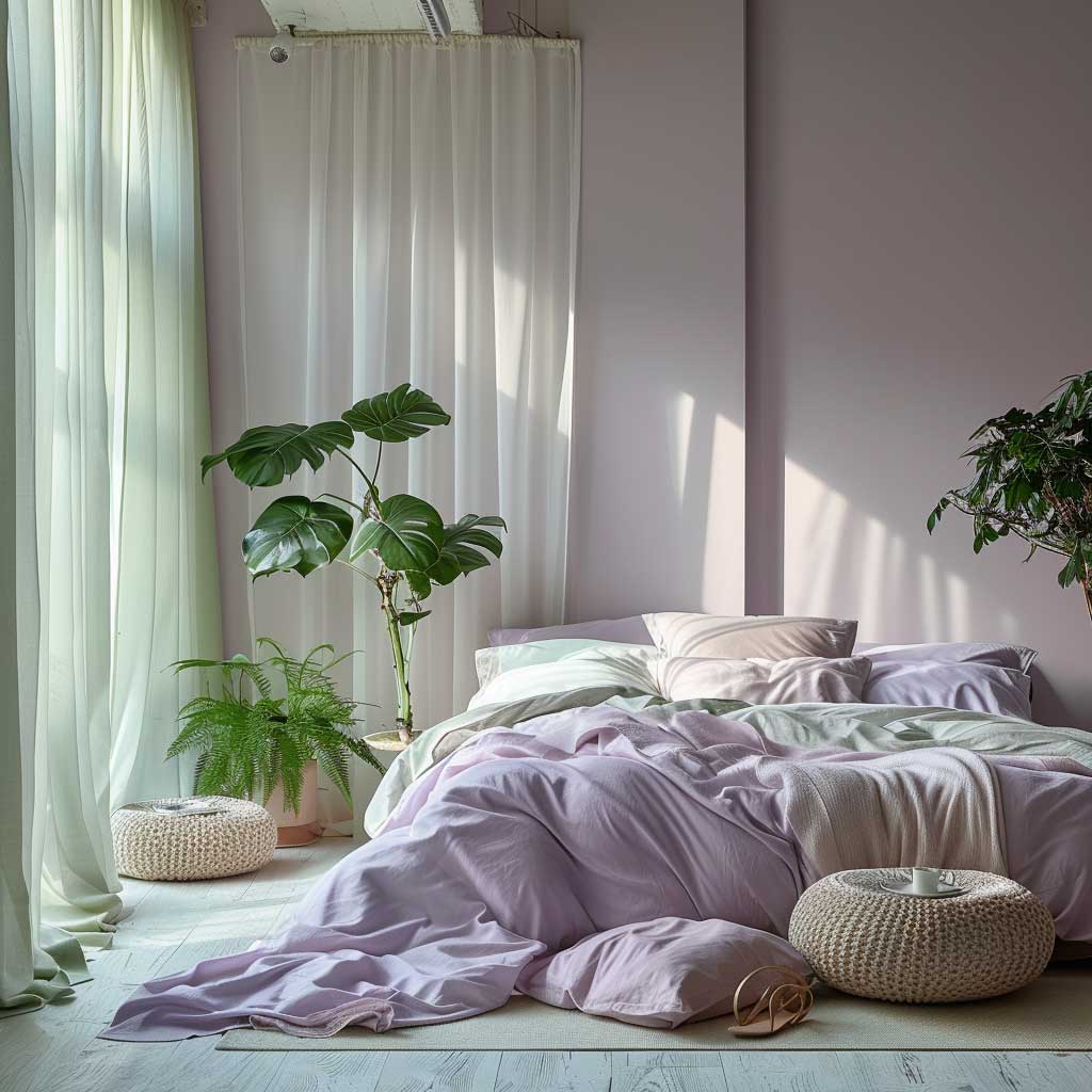 Lush indoor plants serve as a connection to nature, reinforcing the room’s serene atmosphere. The greenery not only purifies the air but also introduces a vibrant contrast to the pastel colours, adding depth and life to the space. The natural light that floods through sheer curtains illuminates the room, highlighting the pastel colours and creating an environment that feels both peaceful and alive.