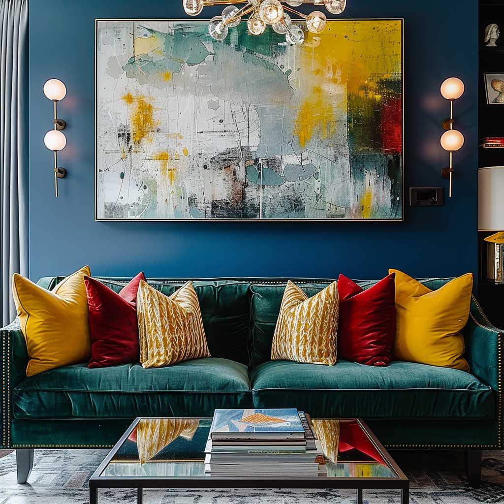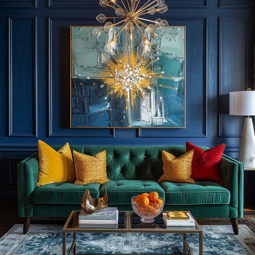 Luxurious textures and modern art pieces play crucial roles in this colour story, adding dimension and character to the space. Textures like velvet or silk in jewel tones can transform a simple piece of furniture into a statement item, enriching the sensory experience of the room. Modern art pieces, whether abstract or figurative, serve as focal points that complement the bold colour choices, introducing personal expression and creativity into the decor.