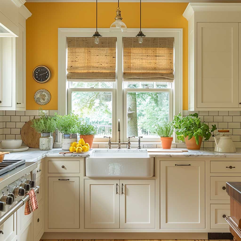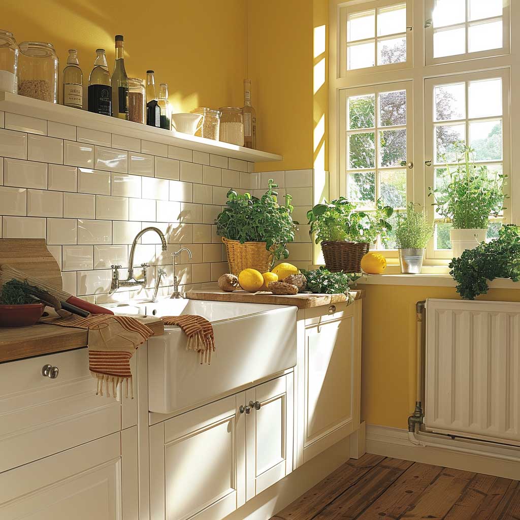 Complementing the yellow walls, white cabinetry creates a crisp, clean look that accentuates the brightness of the room. The contrast between warm yellow and pure white balances the vibrancy of the walls, ensuring the space feels open and airy. This color combination enhances the kitchen’s overall aesthetic, creating a timeless appeal. The white cabinets also offer a neutral backdrop that allows for flexibility in decorating with other colors and textures.