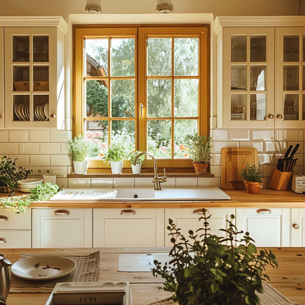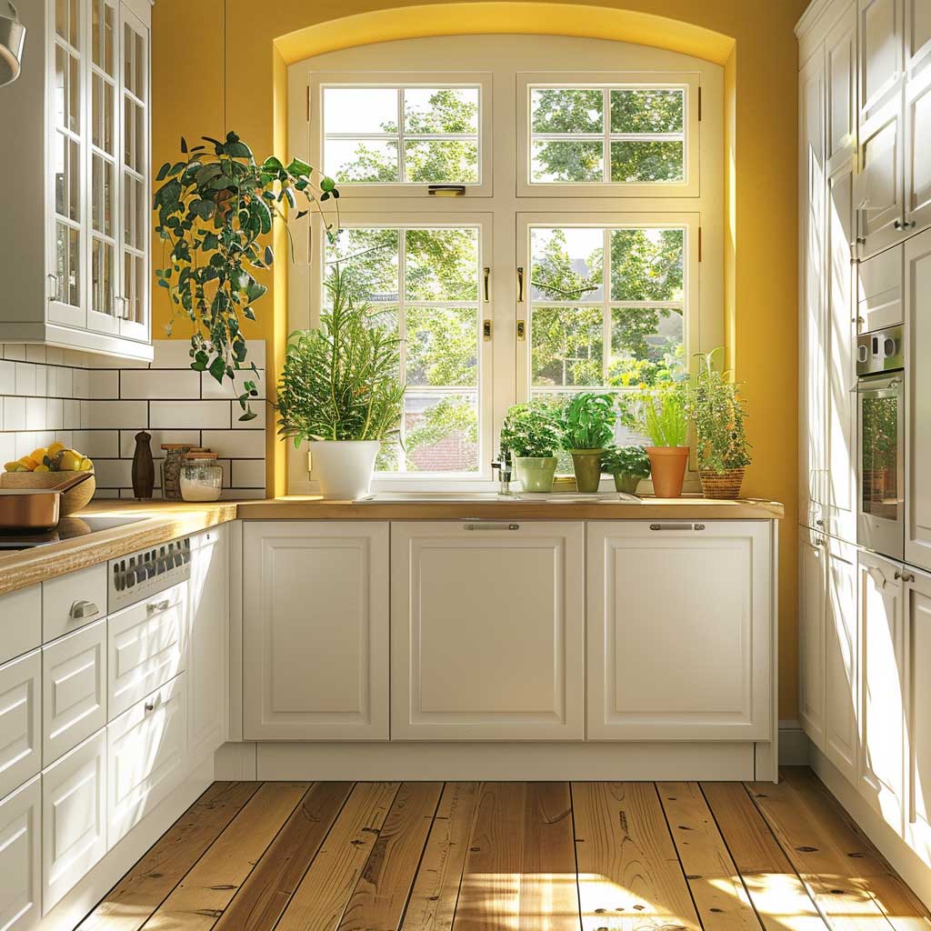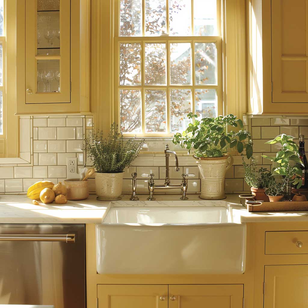 Potted herbs on the windowsill serve as a living decoration, adding a splash of green that contrasts beautifully with the yellow walls. Beyond their aesthetic appeal, these herbs bring a sense of life and freshness to the kitchen, making the act of cooking more interactive and enjoyable. The presence of greenery enhances the connection to nature, reinforcing the kitchen’s role as a nurturing space where food and comfort are created.
