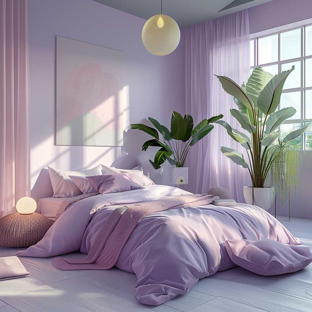The bedroom, being our sanctuary for rest and rejuvenation, calls for a colour palette that mirrors the essence of calmness and relaxation. Soft lavender walls serve as the foundation for this tranquil atmosphere. Lavender, with its subtle hint of warmth, brings a comforting and restful energy into the room. It’s a colour often associated with relaxation techniques and spa environments, making it an ideal choice for a bedroom where the primary goal is to unwind and destress.