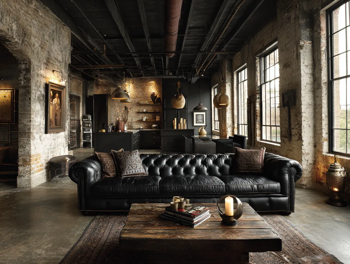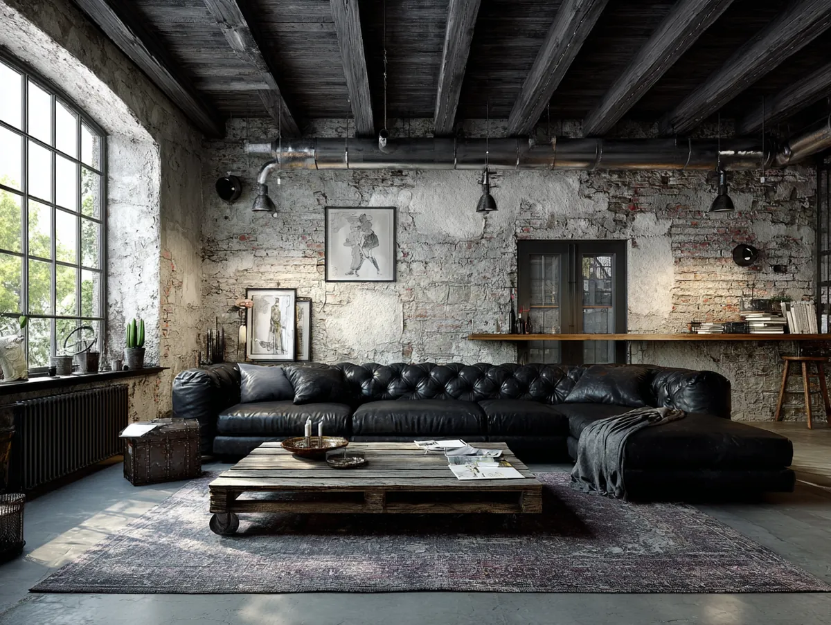 3. Industrial Edge Highlighted by a Sleek Black Sofa