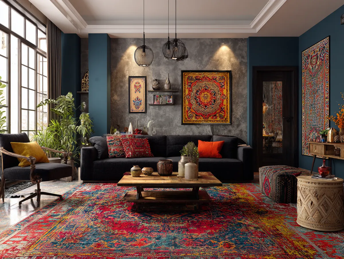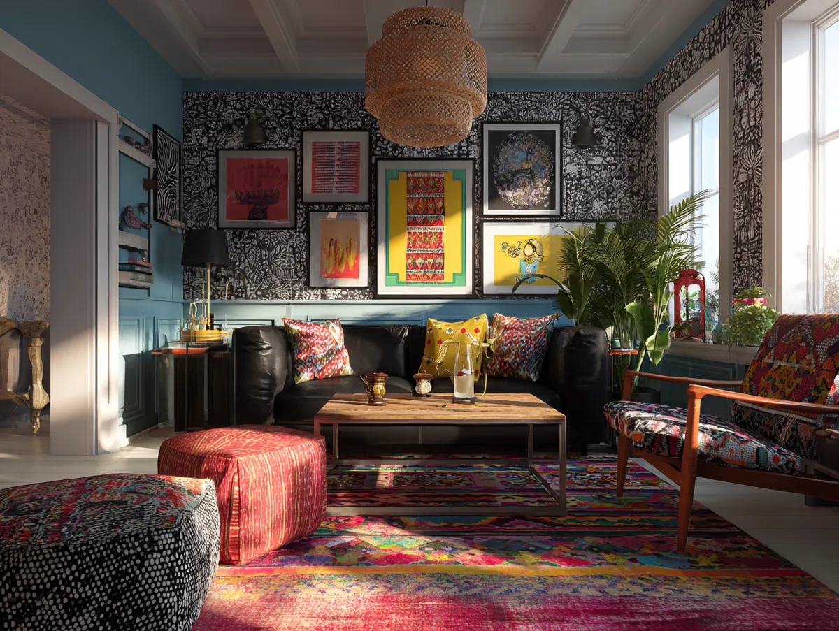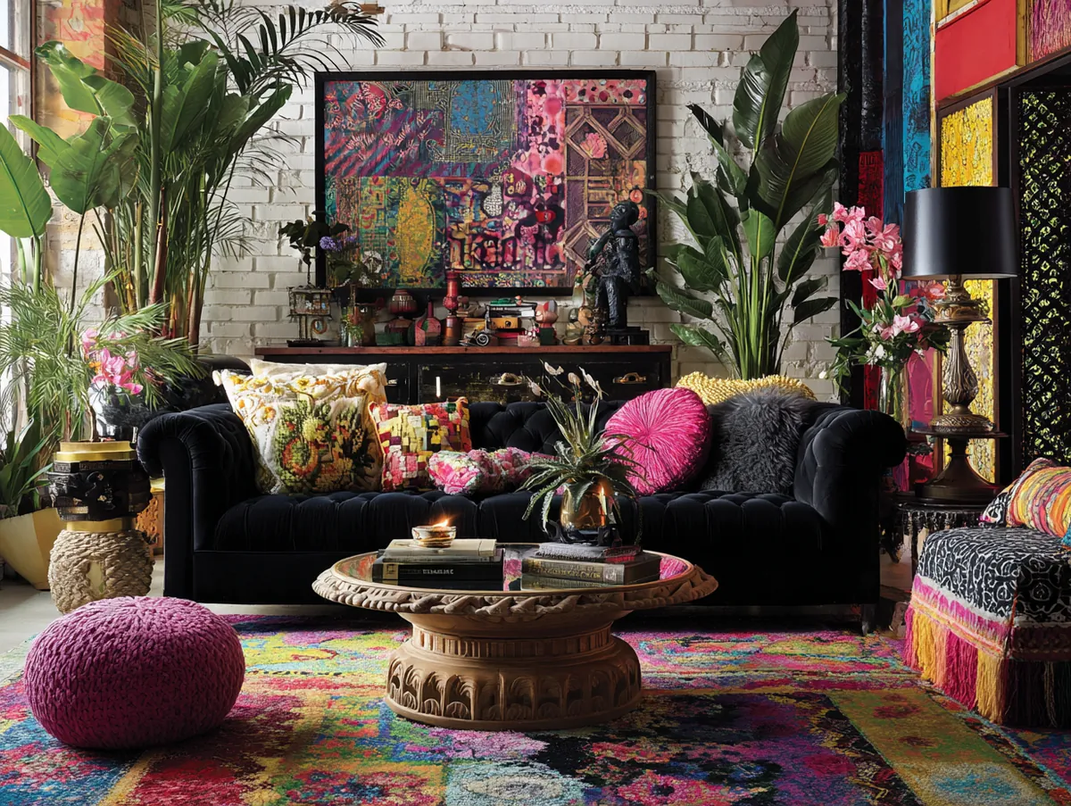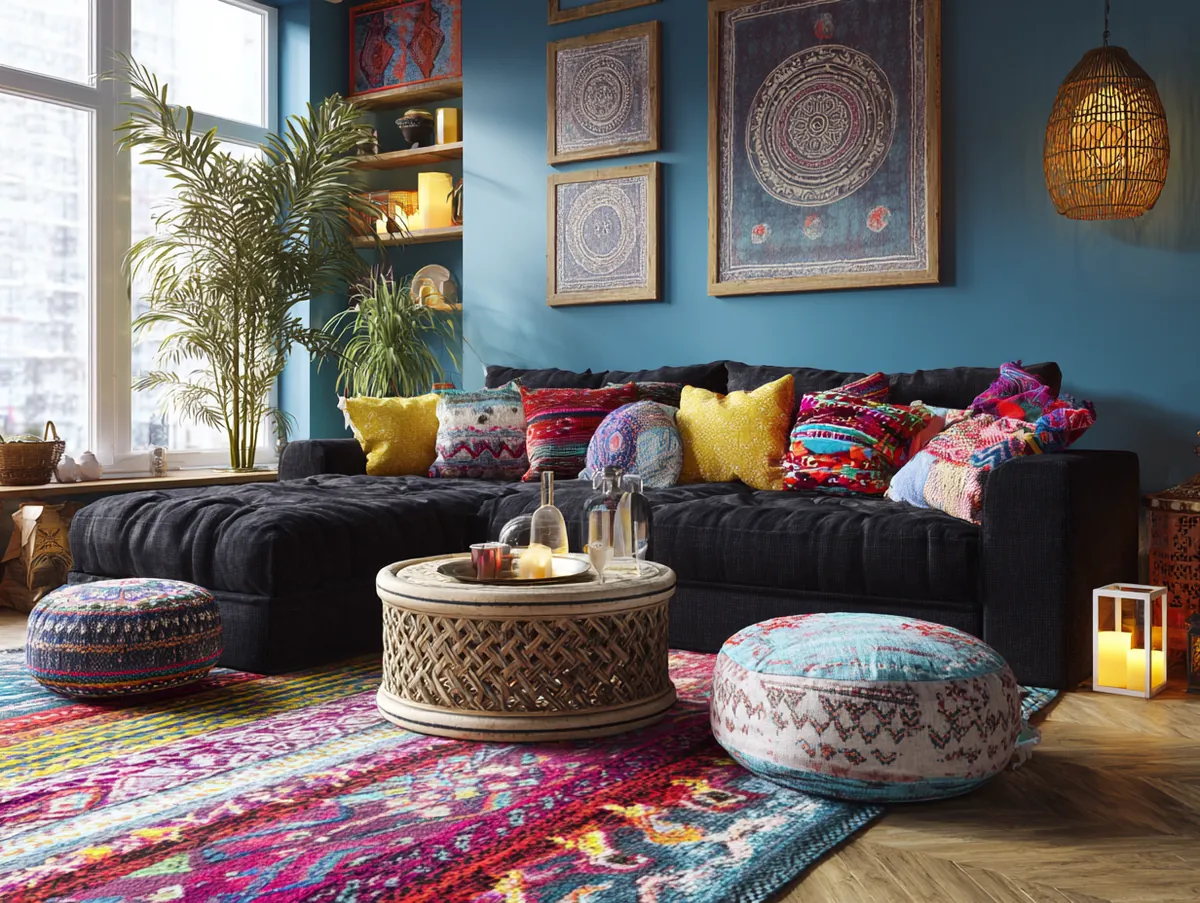2. Bohemian Bliss Featuring a Black Sofa Centerpiece