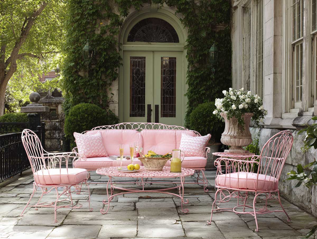 A classic Victorian garden offers the perfect stage for delicately ornate pink patio furniture. At the heart of this style is wrought iron painted in dusty rose or faded blush, crafted with intricate scrolls and floral accents that echo the surrounding blooms. When placed within a manicured garden filled with roses, lavender, and hedgerows, the furniture becomes both functional and sculptural—a soft statement of vintage romance.