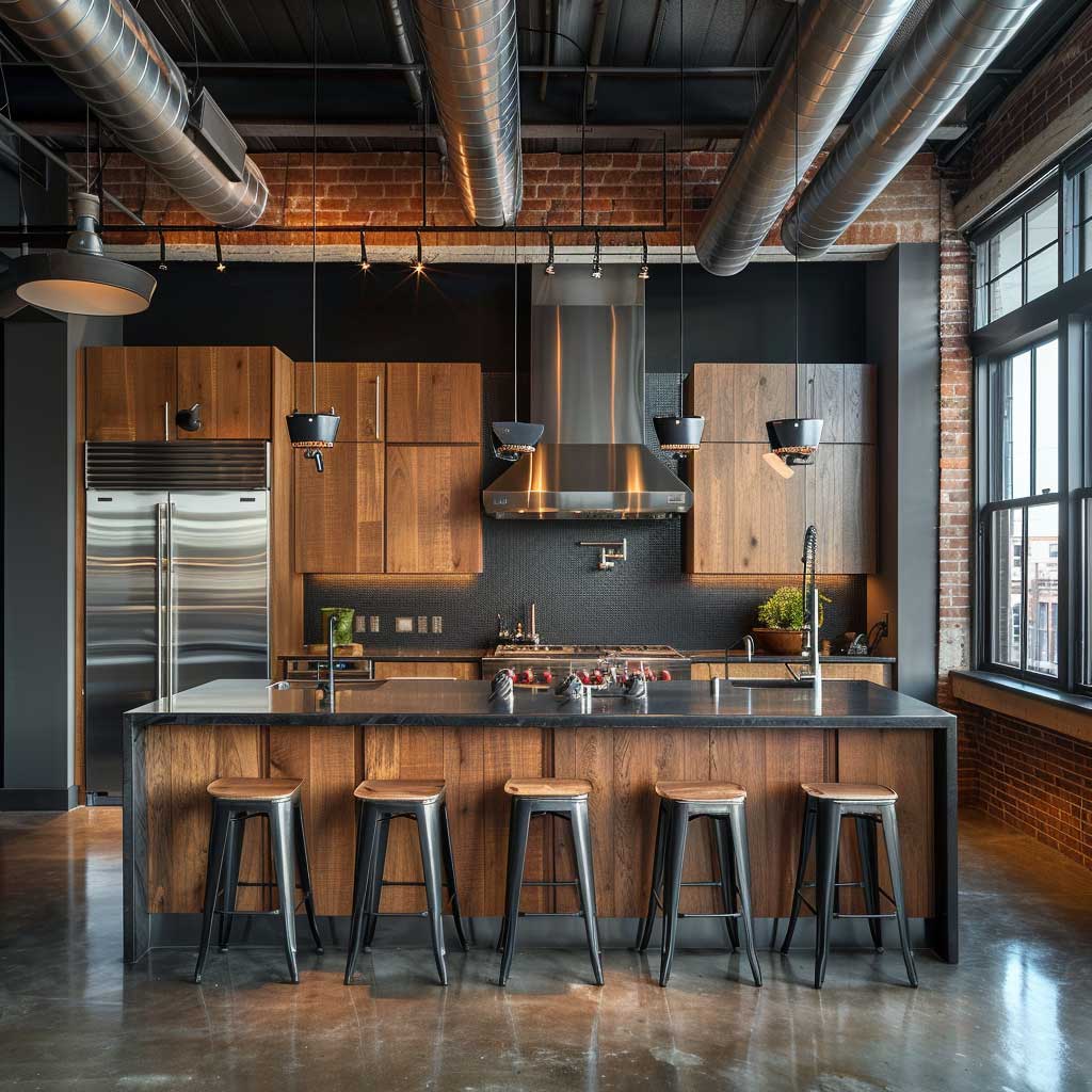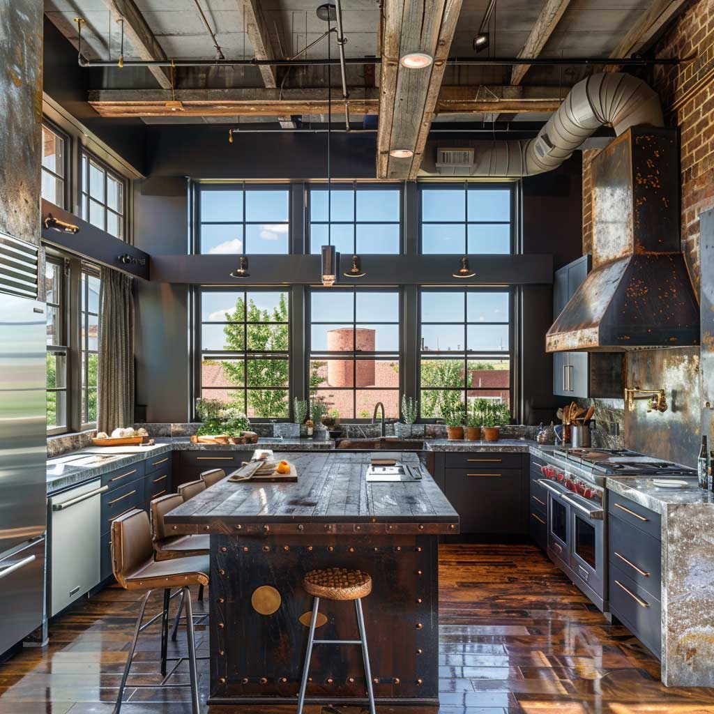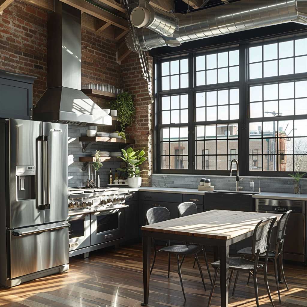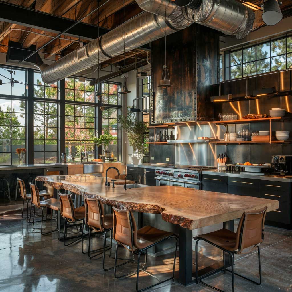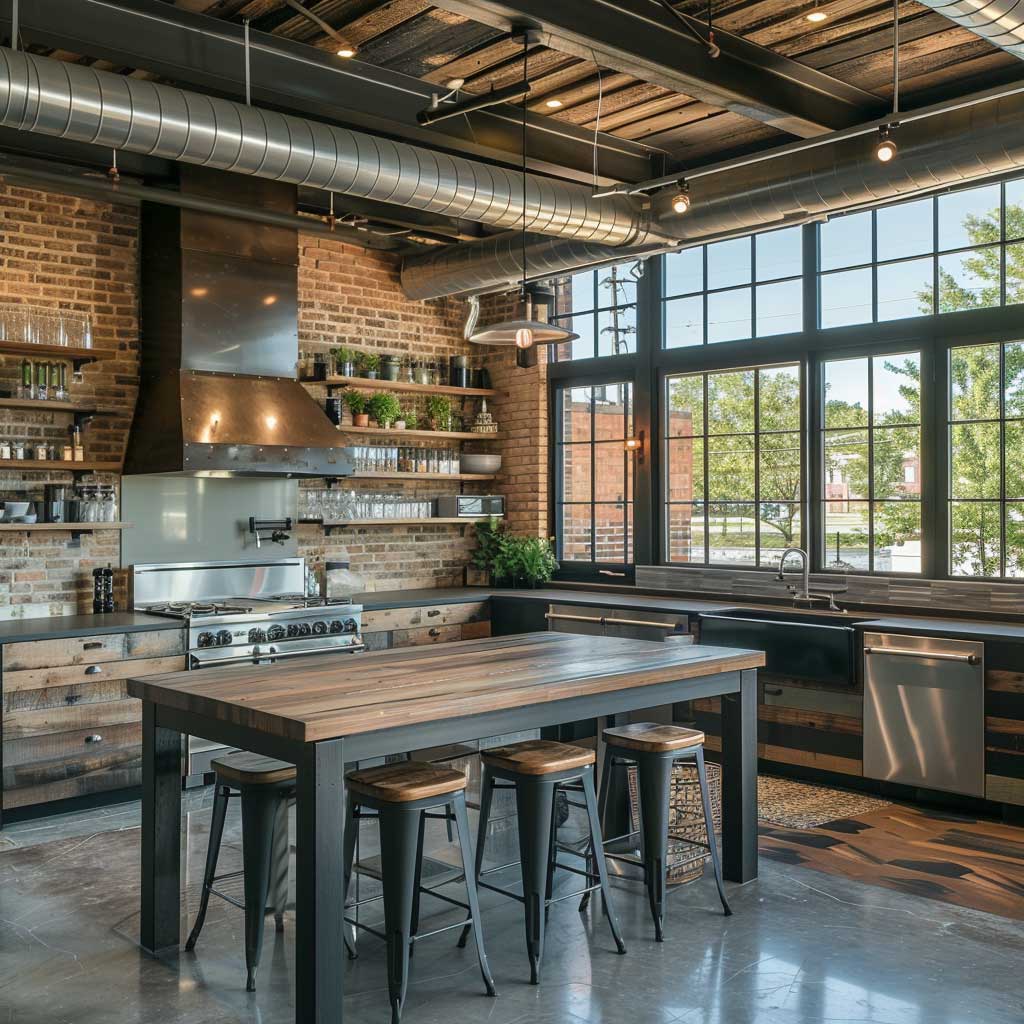 Central to these spaces is the use of exposed ductwork and piping, which adds an authentic industrial feel. This is easily complemented by clever kitchen room design hacks, like a chef’s table crafted from reclaimed wood and metal, blending rustic charm with ruggedness. The table not only serves as a focal point but also as a versatile workspace, perfect for both meal preparation and social gatherings.