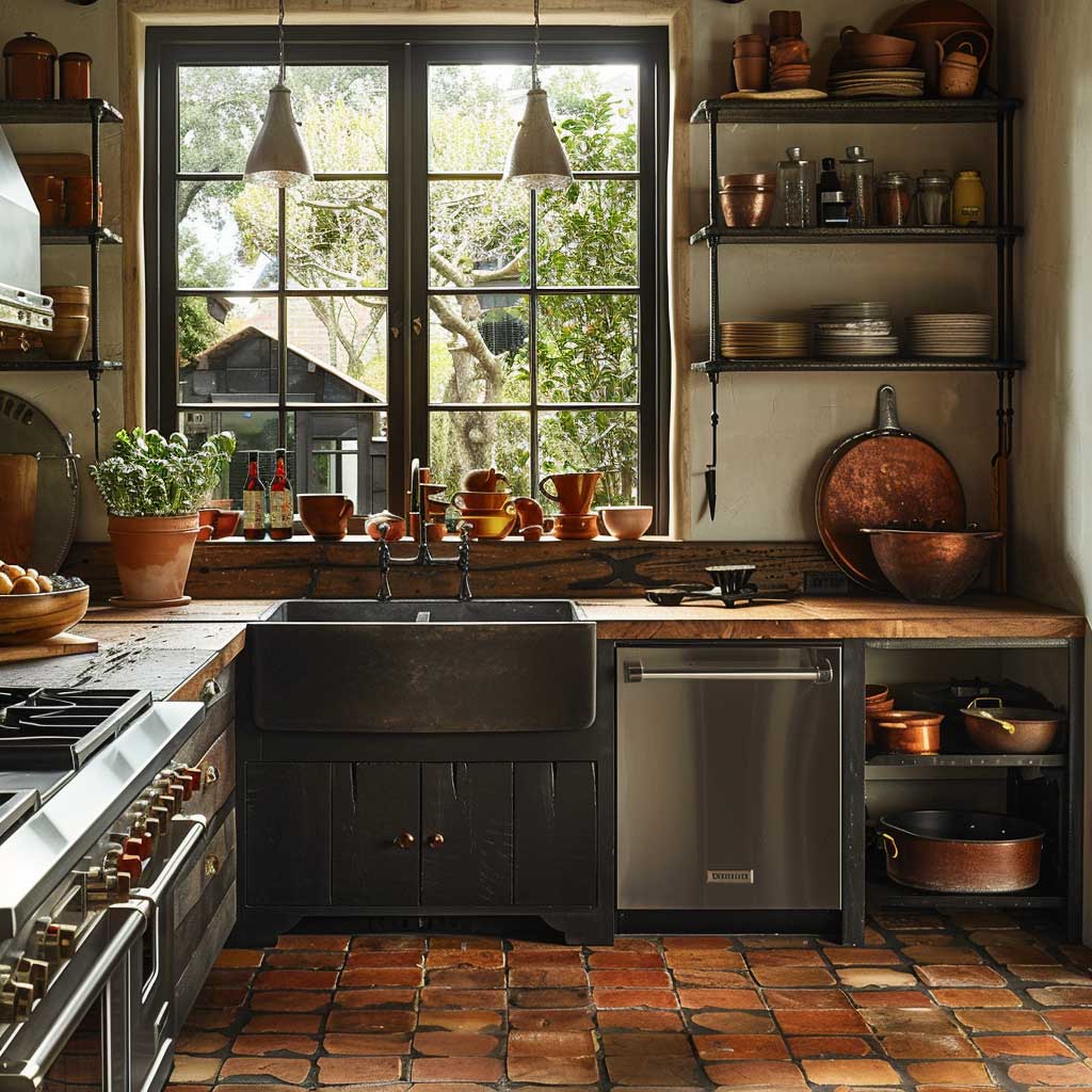Terracotta tile flooring adds immediate warmth to the space, aggressively contrasting with the cooler metal elements typically found in these designs. A massive farmhouse sink under a window fixes the practicality issue for daily tasks. It provides a view outside, making the worst kitchen chores slightly more bearable. The overall atmosphere shifts from a sterile lab to something welcoming, giving you a rustic yet refined aesthetic that actually encourages you to cook.