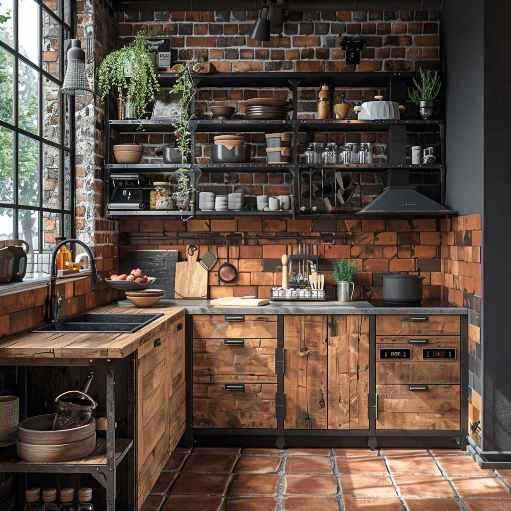 An L-shaped layout is often employed to maximize counter space and improve the flow of movement within the kitchen. Iron-framed shelves line the walls, offering ample storage for kitchen essentials while contributing to the industrial vibe. These open shelves also provide a platform for displaying decorative items, blending functionality with personal style.