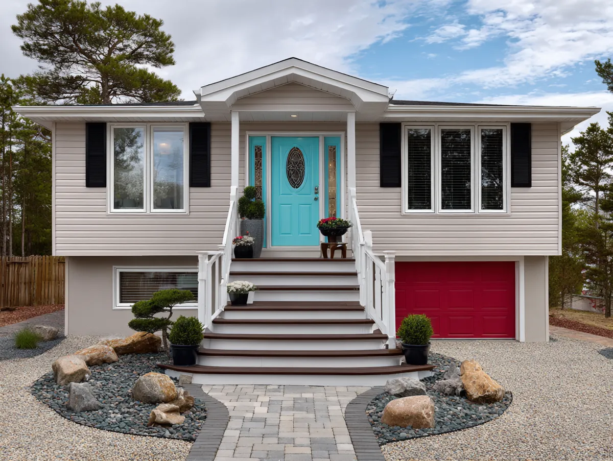 - Vibrant Front Door: One popular split level siding idea is to paint the front door a vibrant and bold color. This creates a focal point and adds personality to your home. For example, you could paint your front door a bold red or blue that complements the main siding color and creates a memorable and impactful first impression.