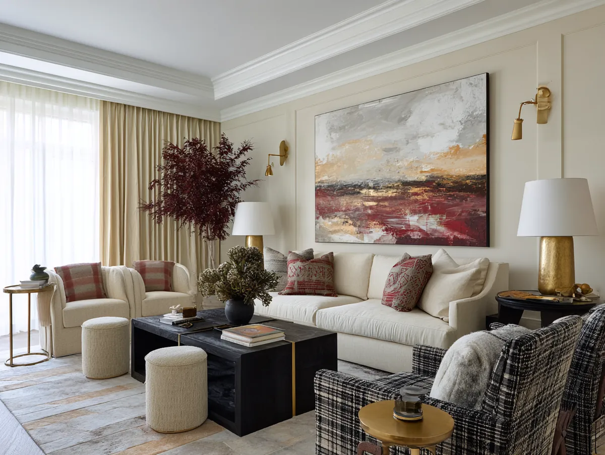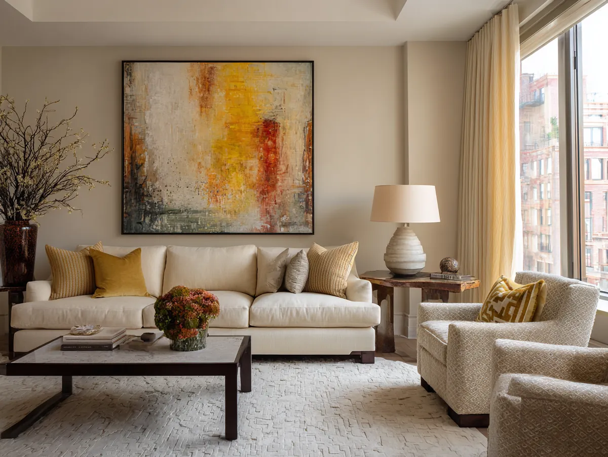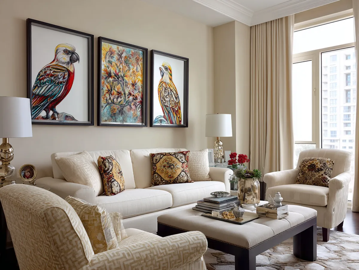 Imagine a beige living room with minimalist furniture. Against one wall hangs a large abstract painting, its bold strokes and vibrant colors contrasting with the beige backdrop. On another wall, a gallery wall showcases a curated collection of artworks, each telling a story of its own. Sculptures, ceramics, and other art pieces are scattered around the room, each adding a touch of artistic flair.