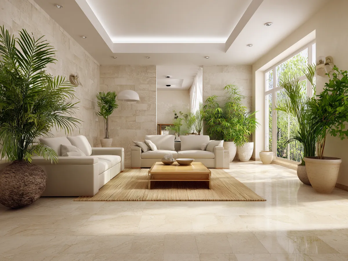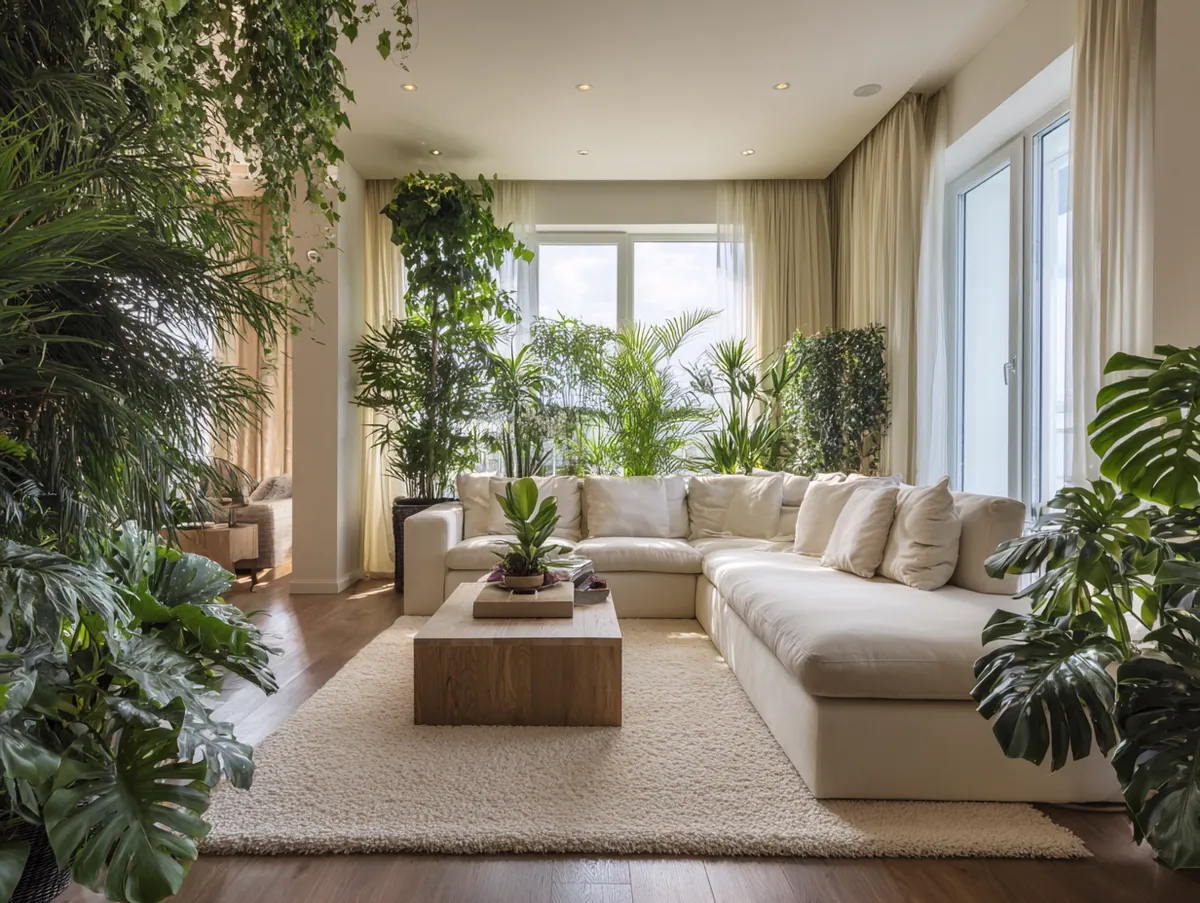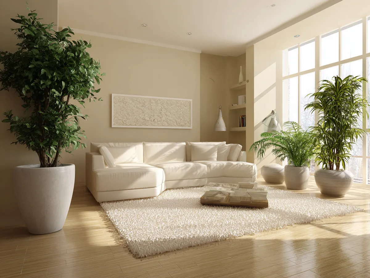 Imagine a beige living room with large windows that let in ample natural light. Against one wall is a tall monstera plant, its split leaves adding a touch of the tropics. Scattered around the room are smaller plants—snake plants on the floor, pothos draping from shelves, and succulents on the coffee table. The beige backdrop makes these plants stand out, their vibrant greens creating a visual contrast.