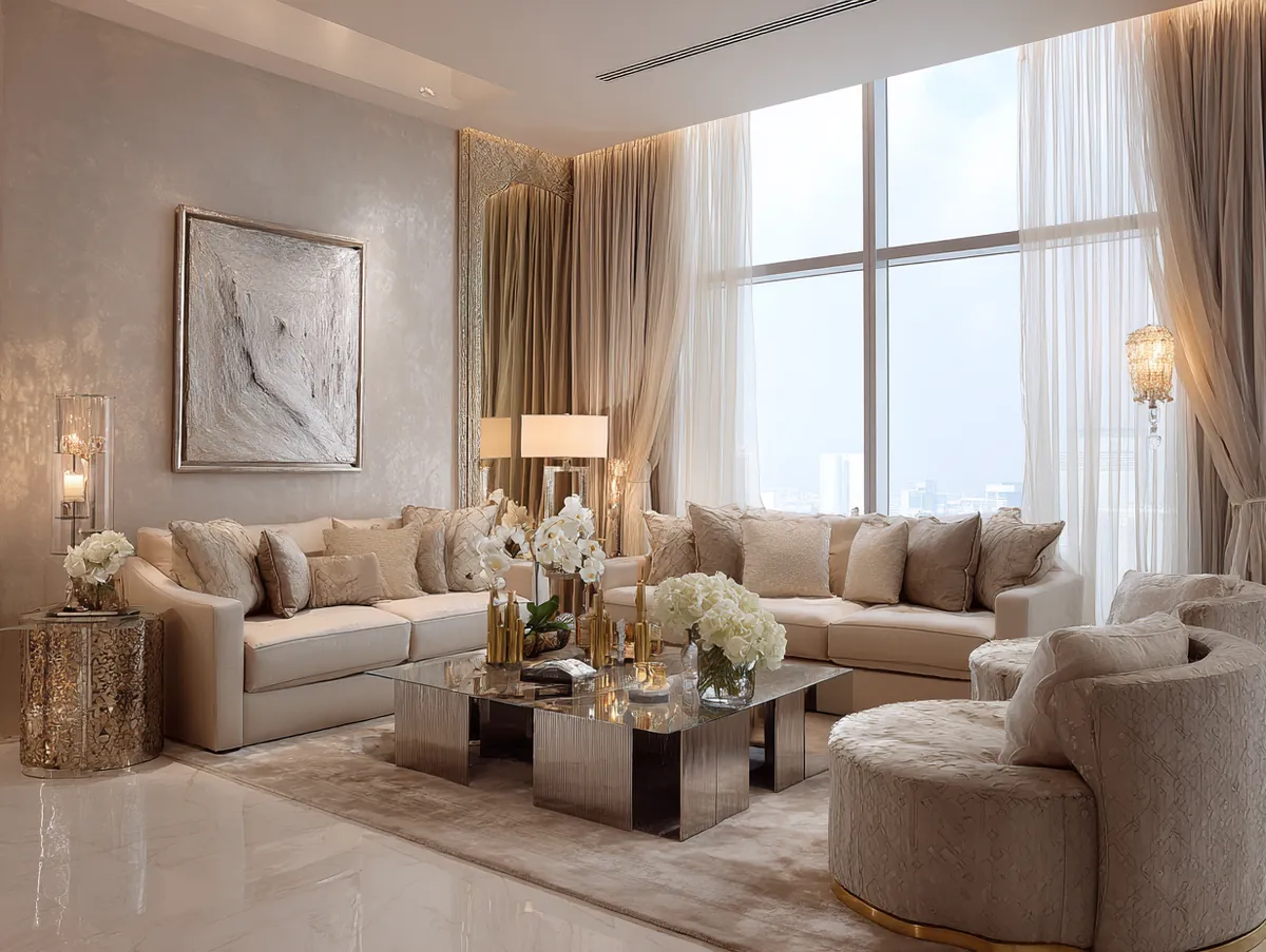 Imagine a beige living room with sleek, minimalist furniture. The coffee table, in a matte beige finish, features gold legs that add a touch of opulence. Above the couch hangs a large mirror with a silver frame, reflecting light and making the room appear larger. On the shelves, decor items in varying metallic shades catch the eye, from gold vases to silver sculptures.