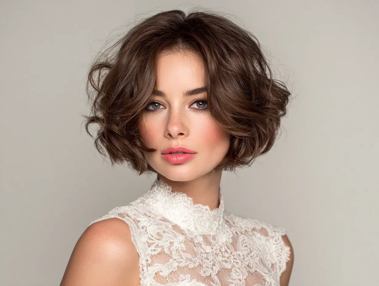 This hairstyle works particularly well for indoor wedding venues adorned with classic décor—think grand ballrooms, historical manors, or softly lit cathedrals. The elegance of the chin length bob lies in its ability to highlight facial features without the heaviness of longer hairstyles. The waves soften the jawline and cheekbones, allowing natural beauty to shine through, while the chin-skimming length keeps the profile structured and photo-ready from every angle.