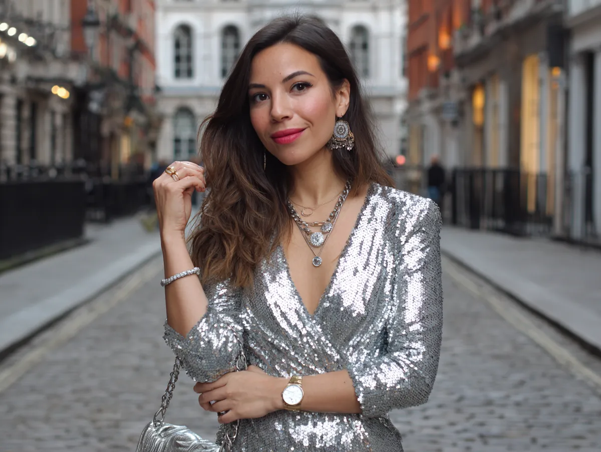 A silver sequin mini dress is the epitome of fun and flirtation, making it a must-have for anyone exploring disco outfit ideas. The short length paired with long sleeves brings a balance between daring and stylish, while the high neckline adds a touch of elegance. This look is perfect for anyone wanting to embrace the boldness of the disco era without losing the sleek, modern edge that makes the style adaptable to contemporary trends.