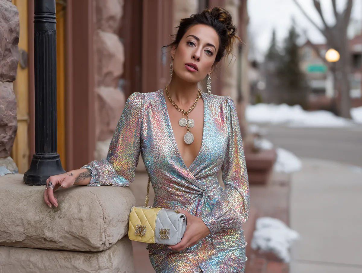 For those looking to infuse bold colors into their disco outfit ideas, a multicolored sequin wrap dress offers the perfect blend of vibrant hues and glamorous sparkle. The wrap style of the dress is both flattering and comfortable, cinching at the waist to create a stunning silhouette that feels as good as it looks. The bold stripes of pink, purple, and blue add a playful energy that is synonymous with the excitement of disco.