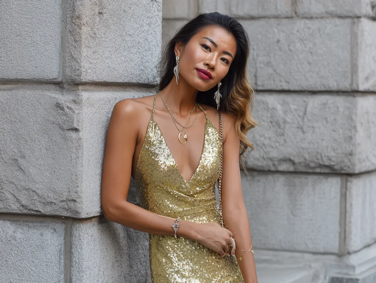 Disco Outfit Ideas with Gold Sequin Gown