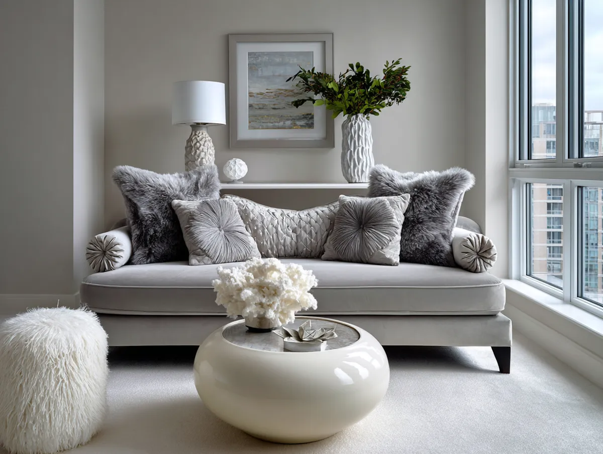 Imagine a deep grey sofa adorned with cushions in varying shades of grey, white, and beige. A soft white rug underfoot, layered with a smaller grey patterned rug. Walls in a light grey hue, with white and beige wall art. The result is a room that feels enveloping, where every shade and texture contributes to the overall ambiance.