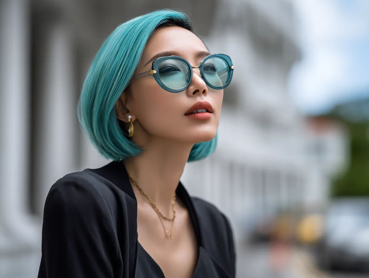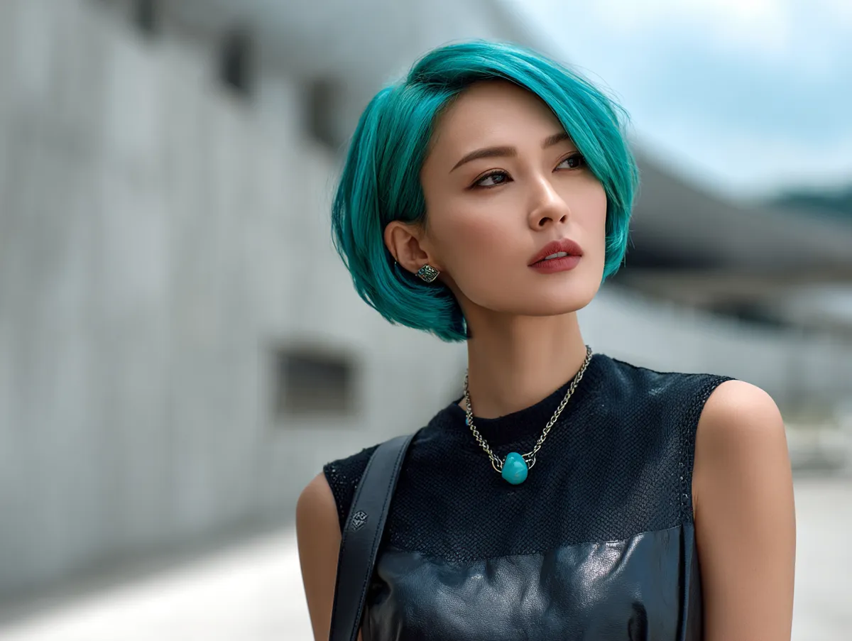 Korean Short Hairstyle with Angled Bob in Turquoise Glow