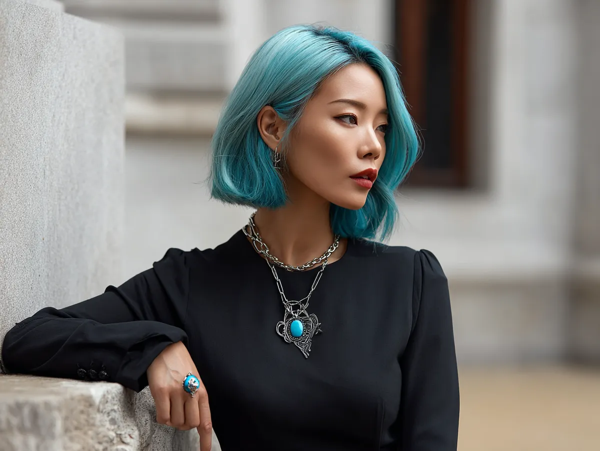 This look thrives in different environments. At the office, it presents sophistication with a polished finish. During casual outings, the turquoise glow sparkles under natural light, offering a playful edge. The balance between elegance and creativity makes this Korean short hairstyle a versatile option that adapts to multiple occasions effortlessly.