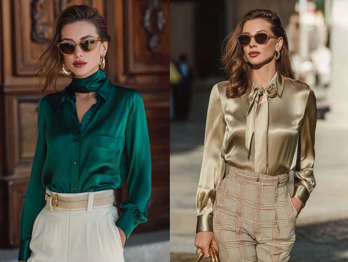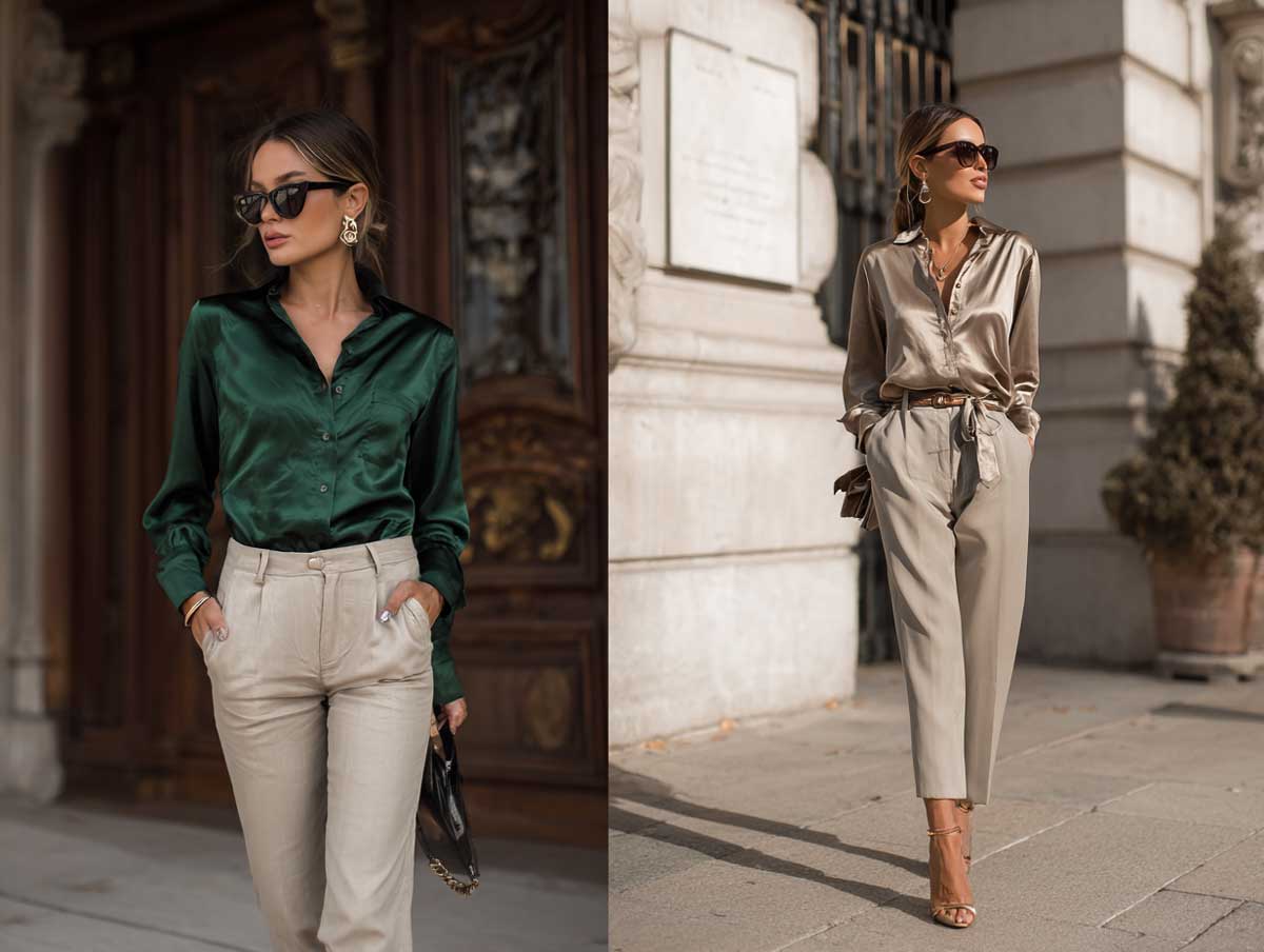 From tailored cigarette pants to flowing palazzos and feminine A-line skirts, the pairing of emerald and taupe opens a world of refined combinations. These hues bring together richness and subtlety, making satin shirt outfit ideas perfect for any setting. Whether styled for sharp professionalism, graceful elegance, or standout drama, each look captures satin’s ability to transform an outfit into a statement of effortless luxury. When thoughtfully layered and accessorized, emerald and taupe deliver timeless impact season after season.