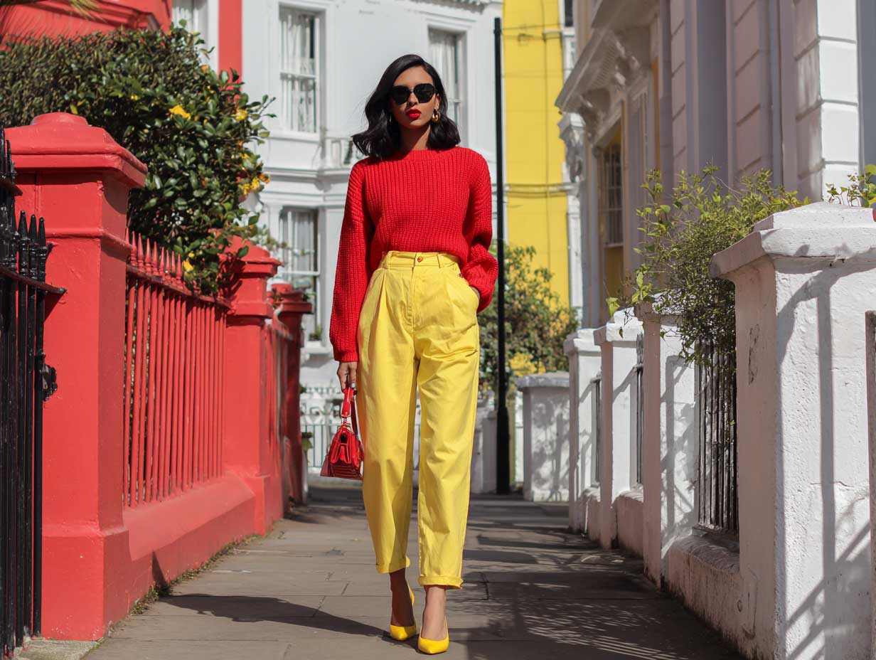 Enter the cherry red bag—a structured, medium-sized crossbody that slices through the yellow with intent. Red accessories pack a visual punch and help anchor a look built on bright tones. Instead of competing, the red enhances and sharpens the outfit. The placement across the body also ensures the color is central and cohesive without overpowering the whole outfit.