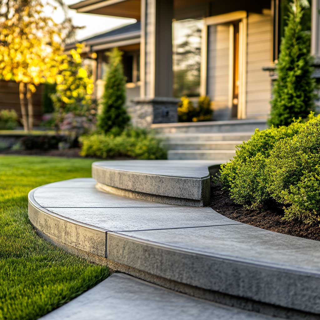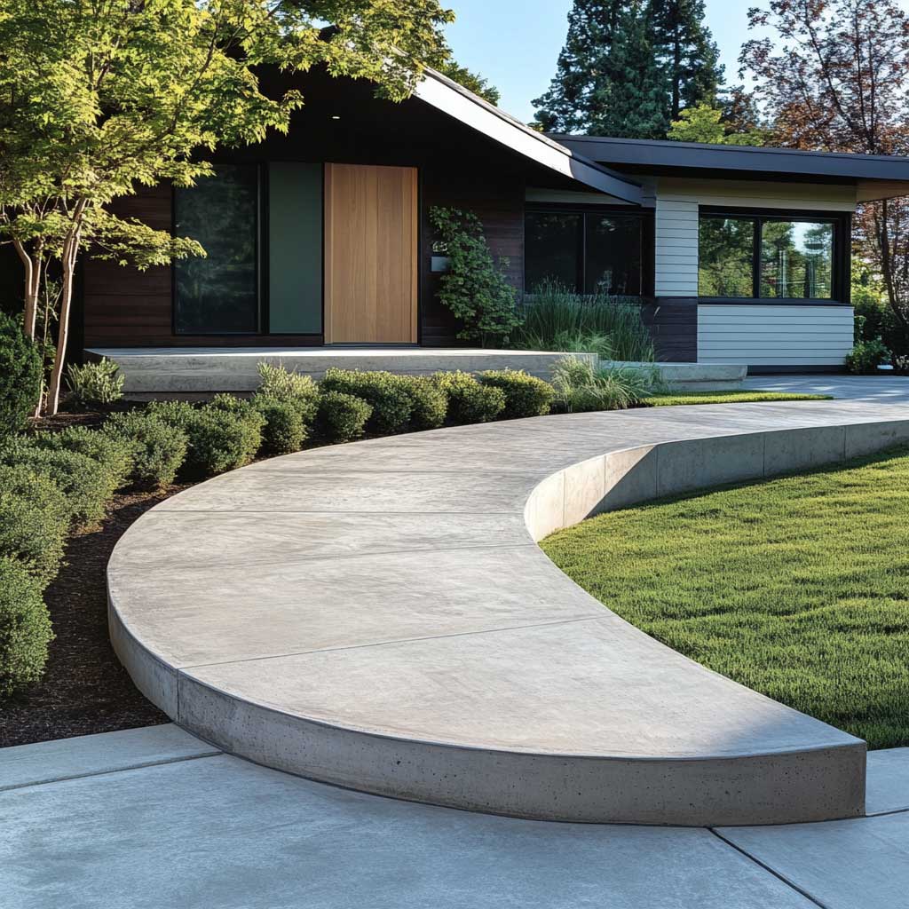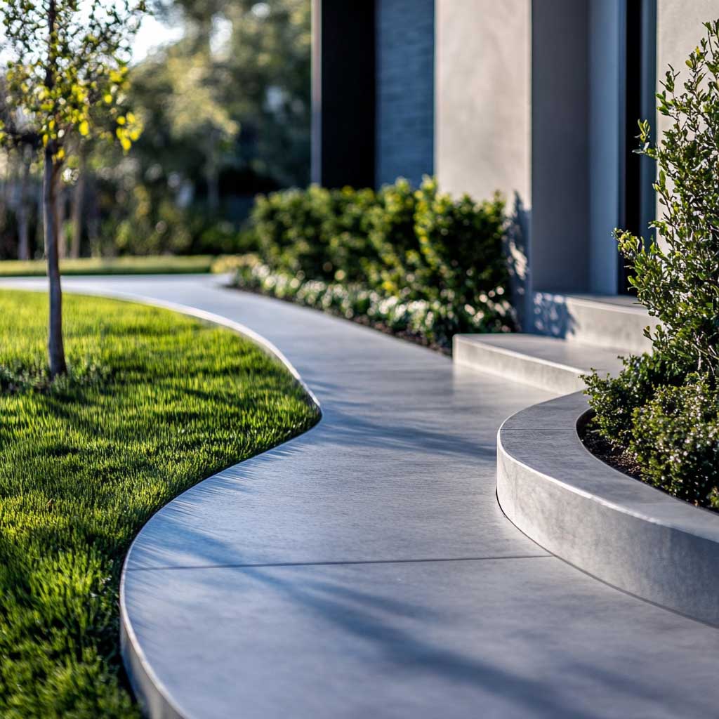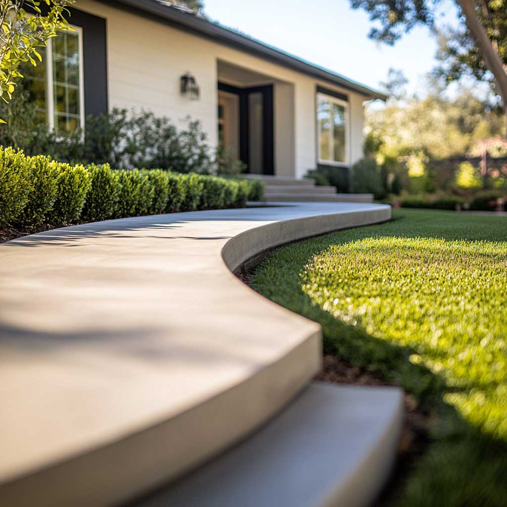 The soft, natural gray of the concrete is versatile and neutral, blending seamlessly with various landscaping elements and architectural styles. The smooth finish of the pathway and steps gives the entrance a clean, polished look that is both inviting and understated. This simplicity allows the focus to remain on the form and flow of the design, rather than on any ornamental details.