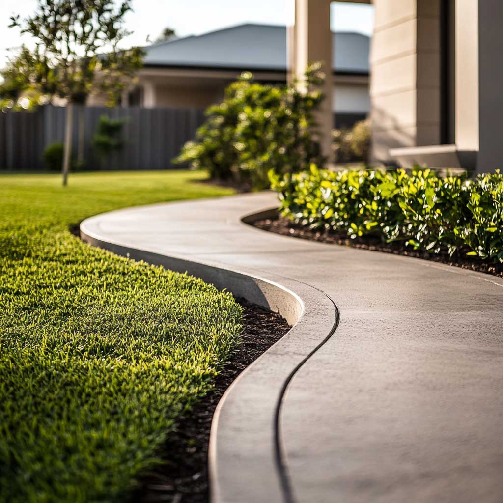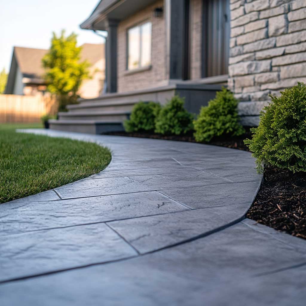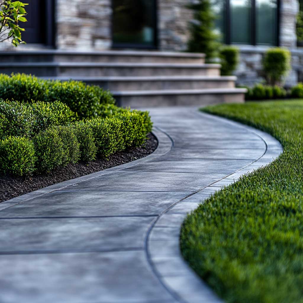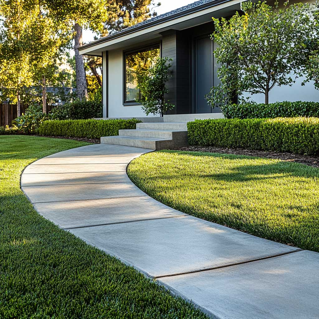 The soft, natural gray of the concrete is versatile and neutral, blending seamlessly with various landscaping elements and architectural styles. The smooth finish of the pathway and steps gives the entrance a clean, polished look that is both inviting and understated. This simplicity allows the focus to remain on the form and flow of the design, rather than on any ornamental details.