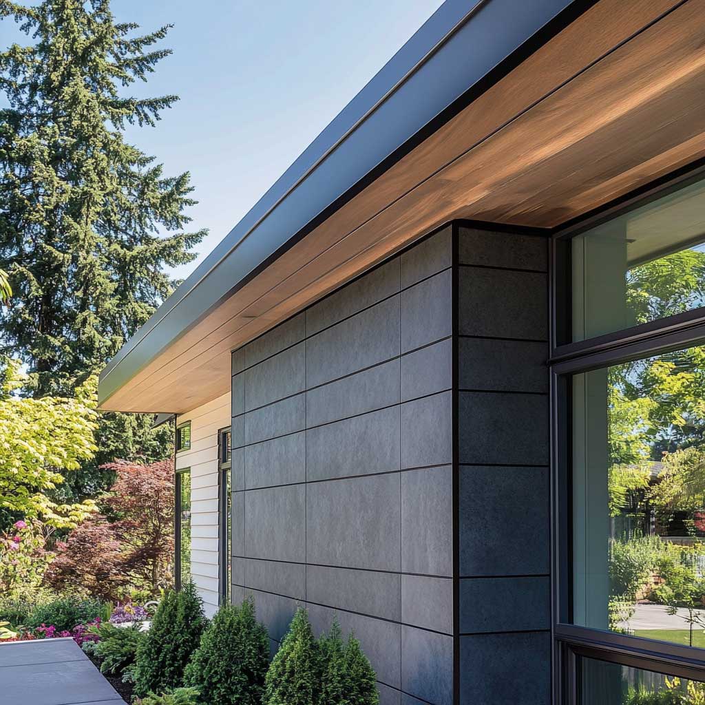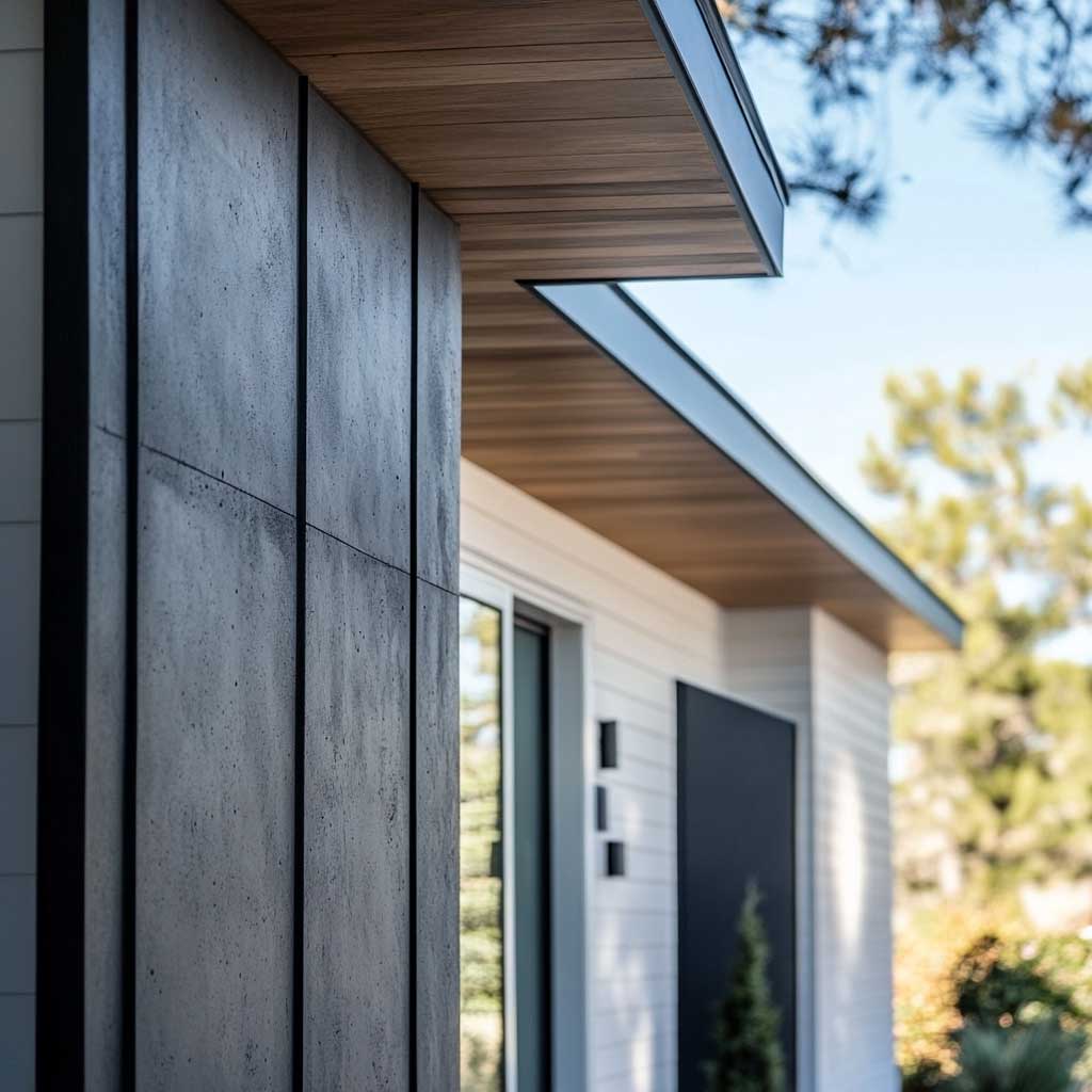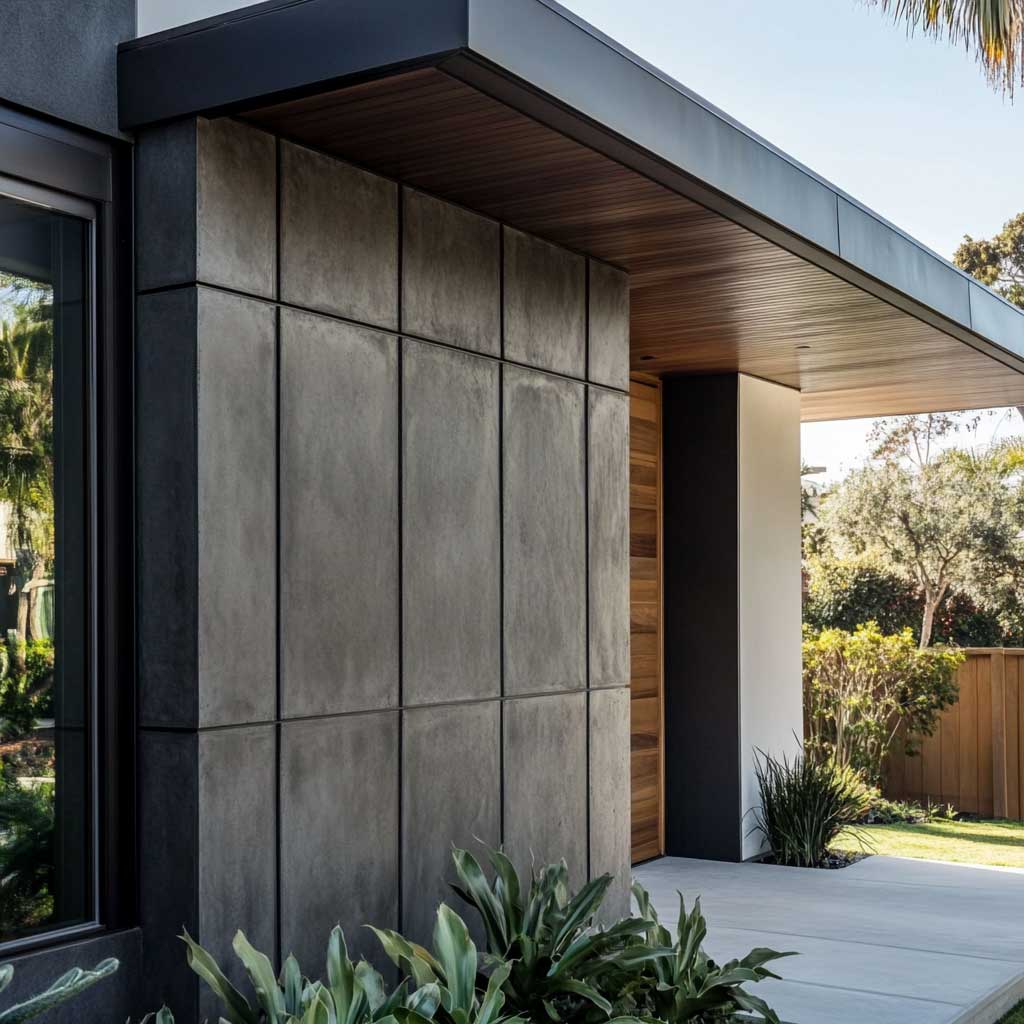 A concrete accent wall introduces a dramatic and modern element to bungalow exterior design, offering a bold contrast to more traditional materials like wood or siding. The deep charcoal gray of the concrete creates a striking visual impact, instantly drawing attention to the feature while adding depth and dimension to the facade.