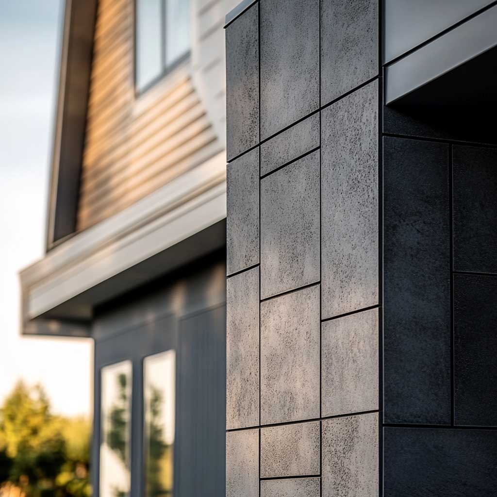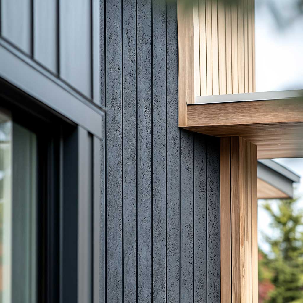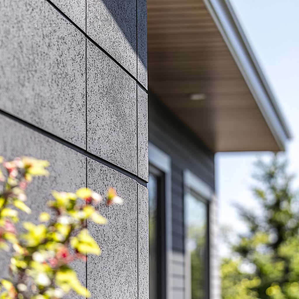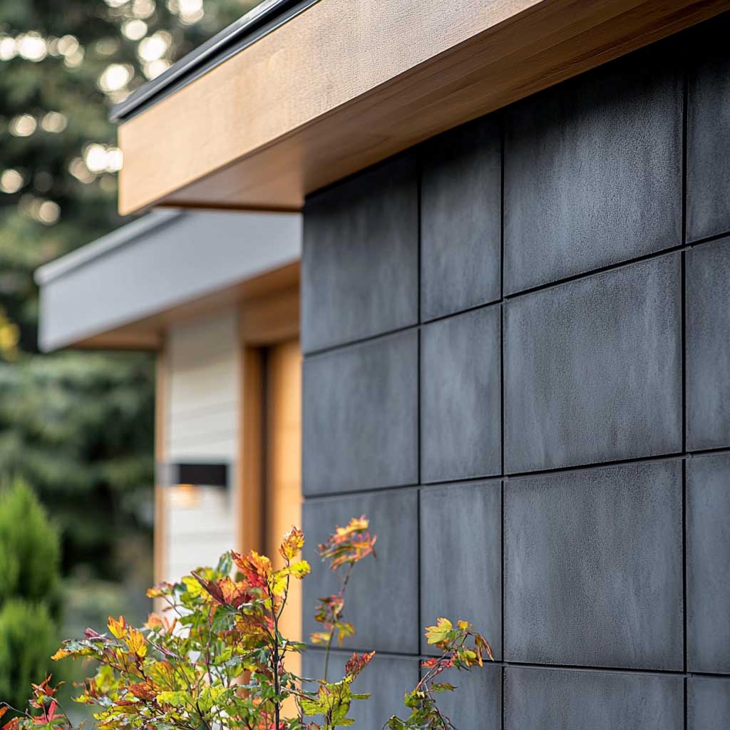 A concrete accent wall introduces a dramatic and modern element to bungalow exterior design, offering a bold contrast to more traditional materials like wood or siding. The deep charcoal gray of the concrete creates a striking visual impact, instantly drawing attention to the feature while adding depth and dimension to the facade.
