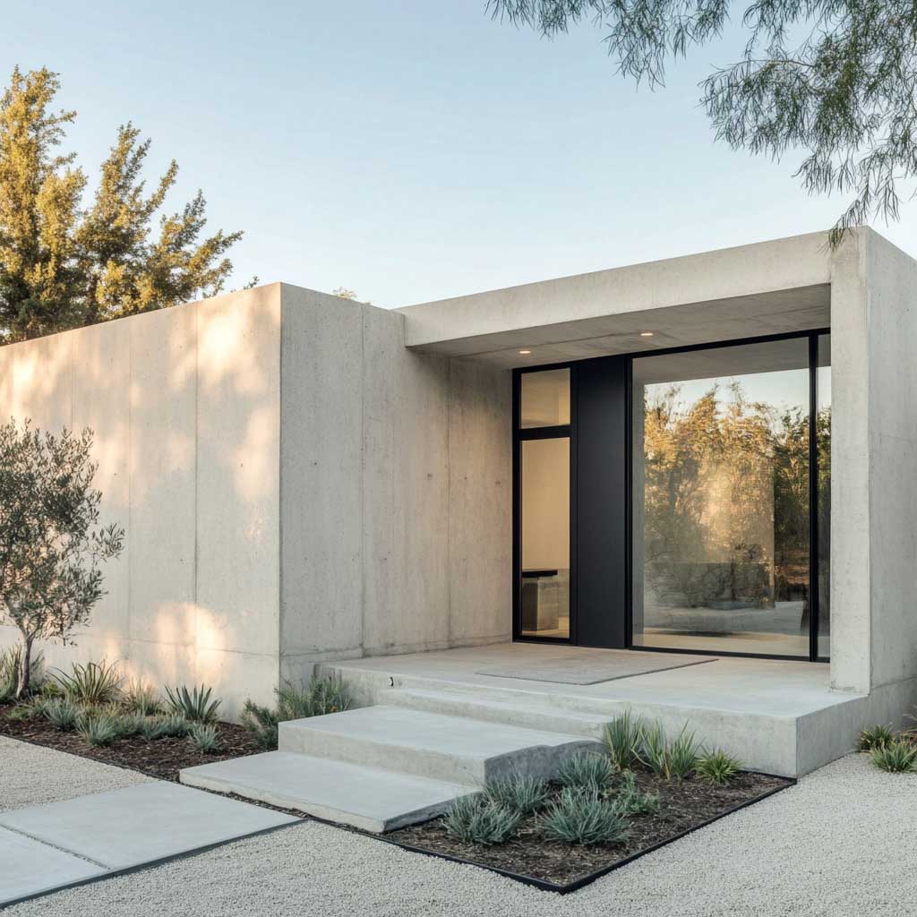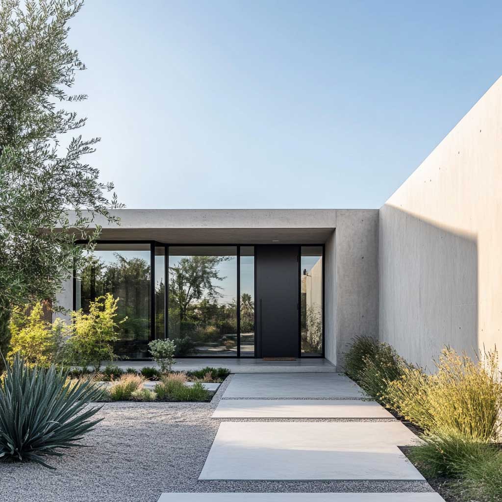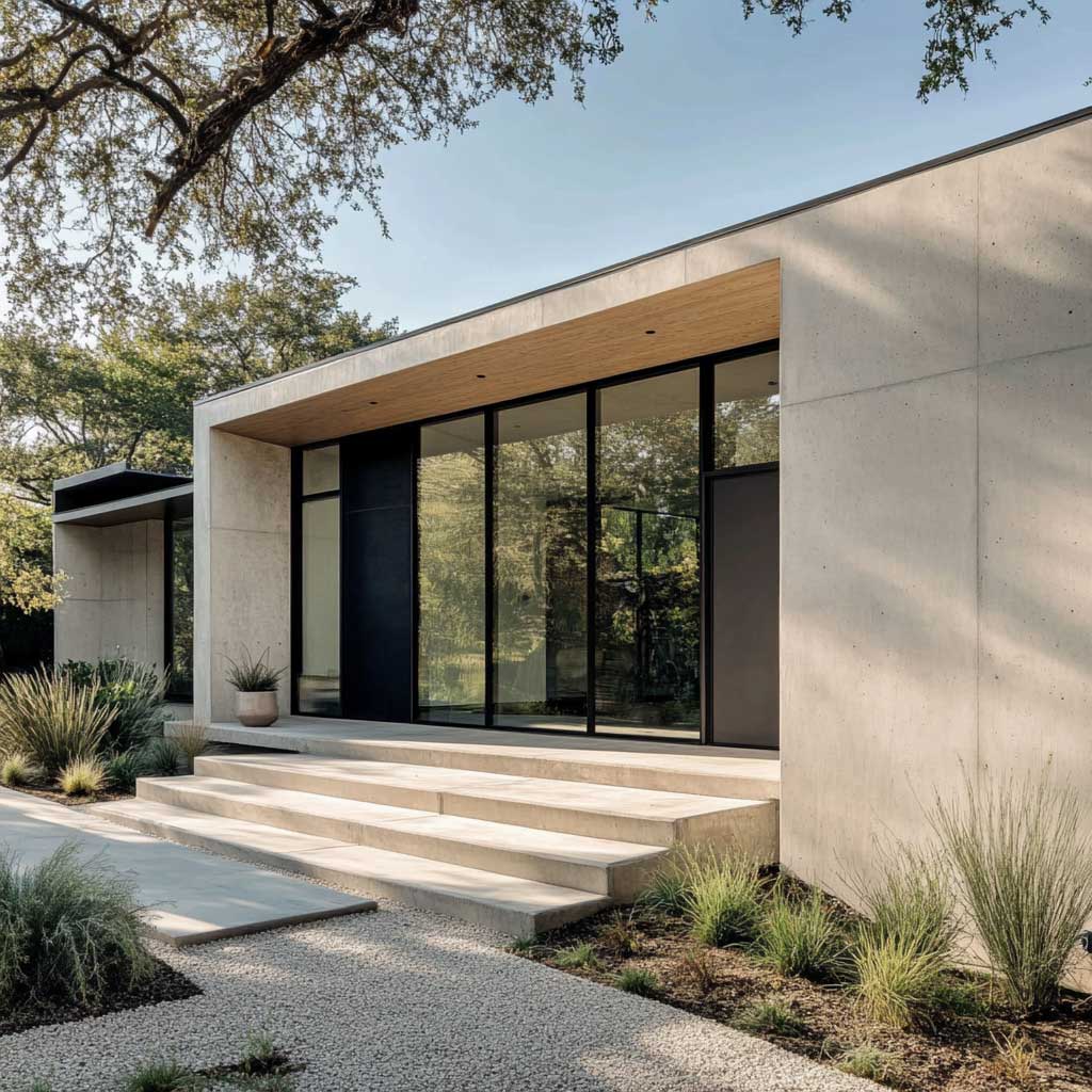 Concrete steps leading up to the entrance further enhance the sense of arrival, offering a sturdy and stable surface for visitors. These steps are designed with both safety and style in mind, ensuring that they are wide enough to be comfortable while maintaining a sleek, minimalist appearance. The use of concrete for steps is particularly beneficial in terms of durability, as it can withstand heavy foot traffic and resist weathering over time.