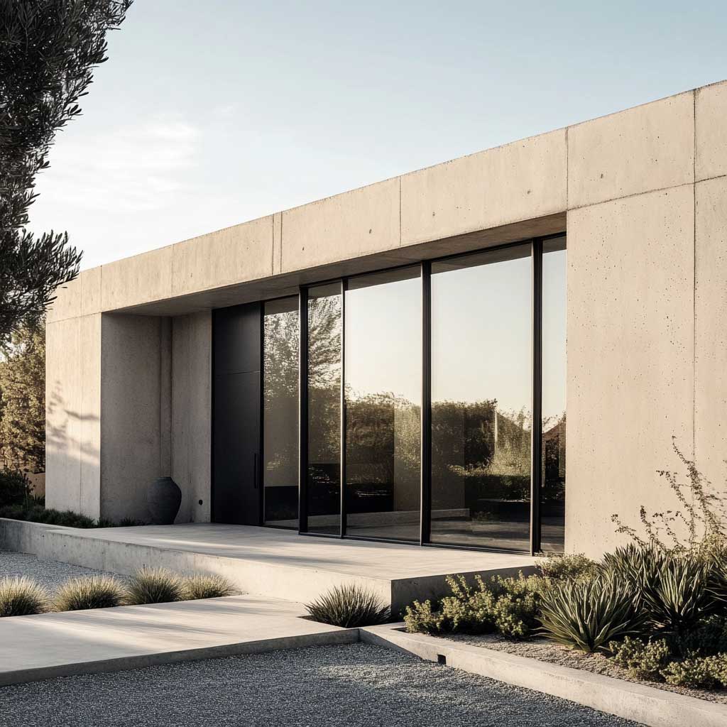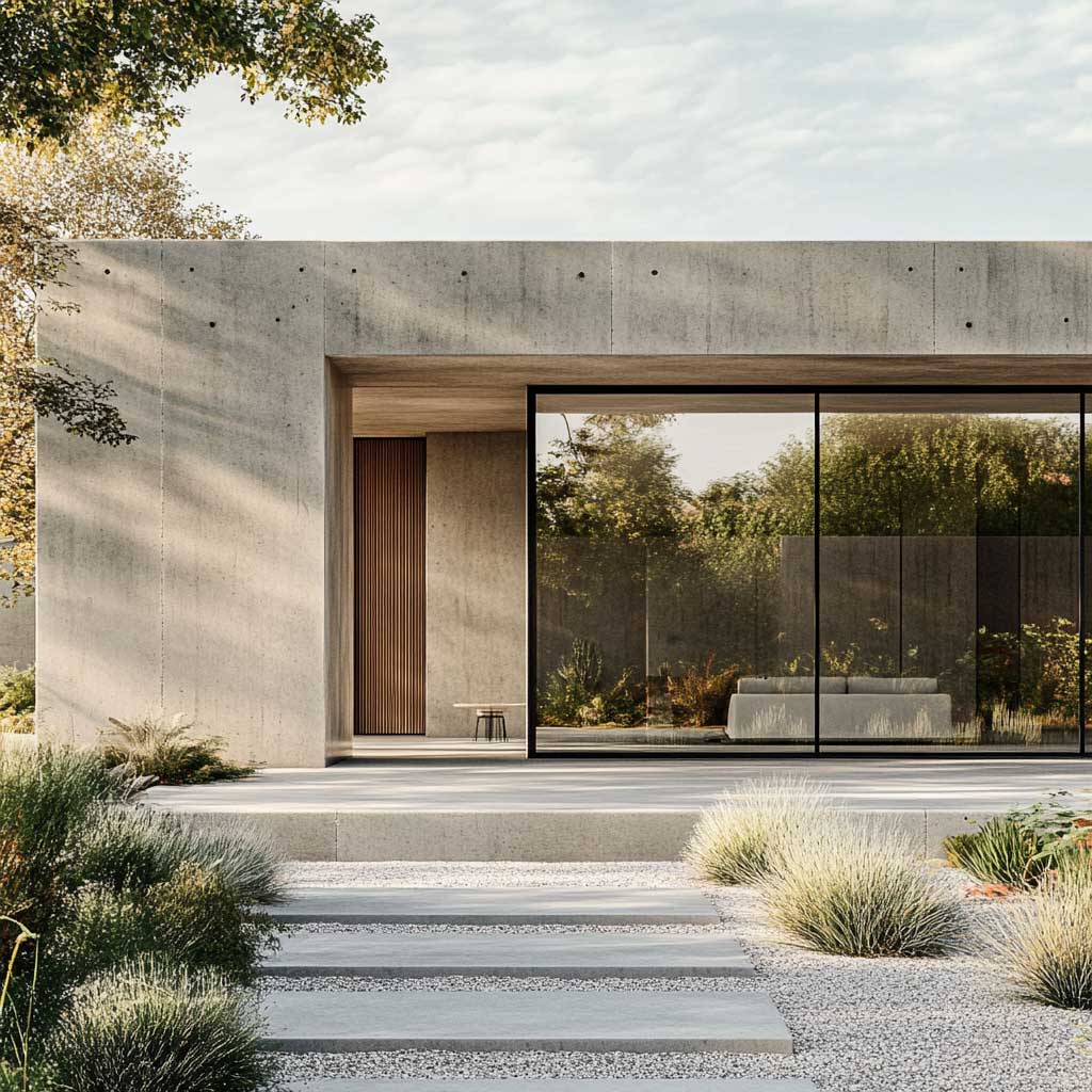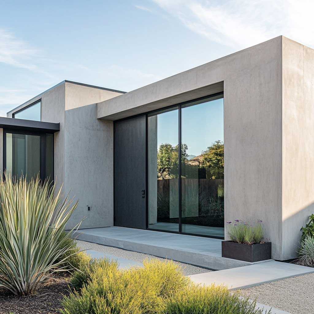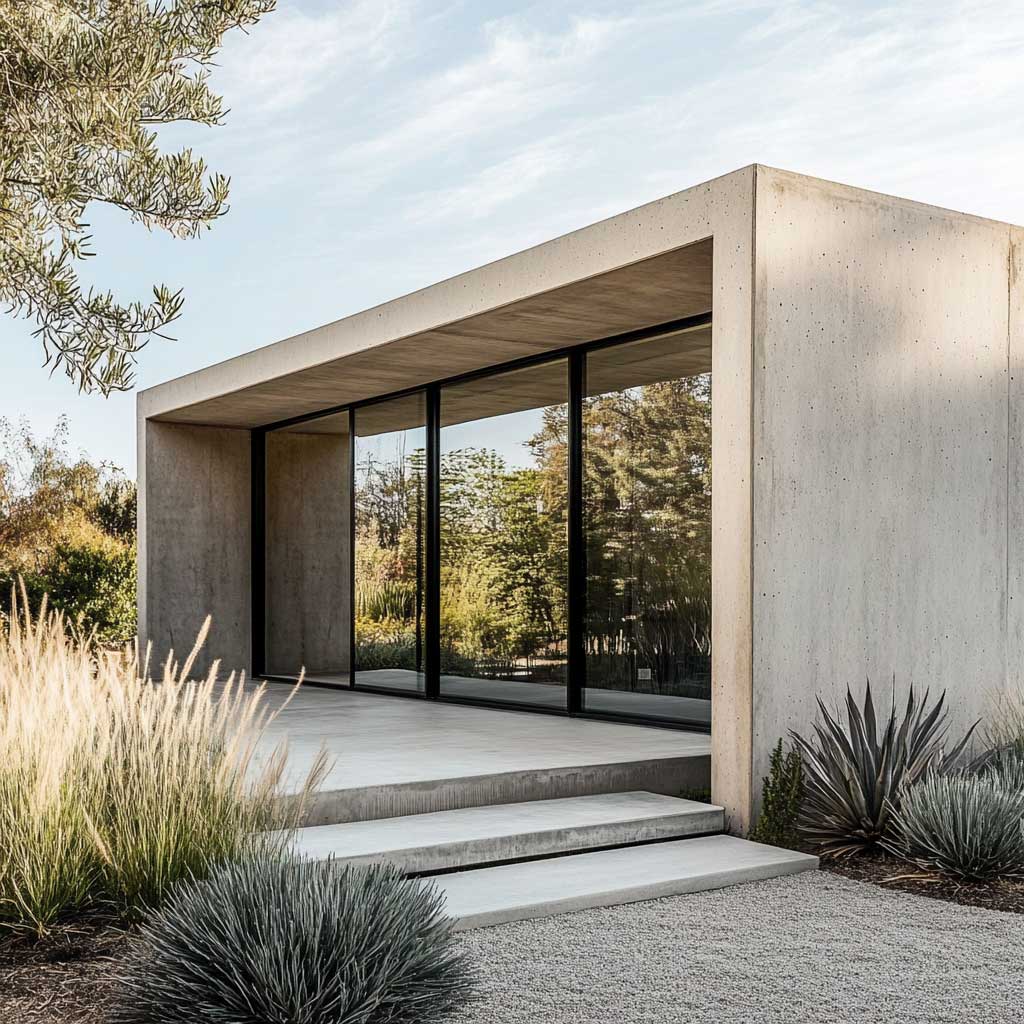 Concrete steps leading up to the entrance further enhance the sense of arrival, offering a sturdy and stable surface for visitors. These steps are designed with both safety and style in mind, ensuring that they are wide enough to be comfortable while maintaining a sleek, minimalist appearance. The use of concrete for steps is particularly beneficial in terms of durability, as it can withstand heavy foot traffic and resist weathering over time.