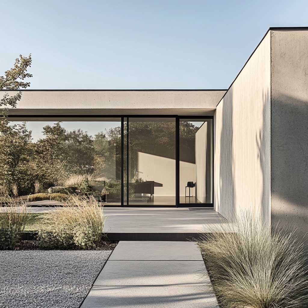 The light gray hue of the concrete, combined with its subtle textures, adds depth and interest to the exterior without overwhelming the overall simplicity of the design. This minimalist approach allows the focus to remain on the quality and craftsmanship of the materials used. The large glass windows complement the concrete by introducing an element of transparency and lightness, creating a harmonious balance between solid and void, open and closed.