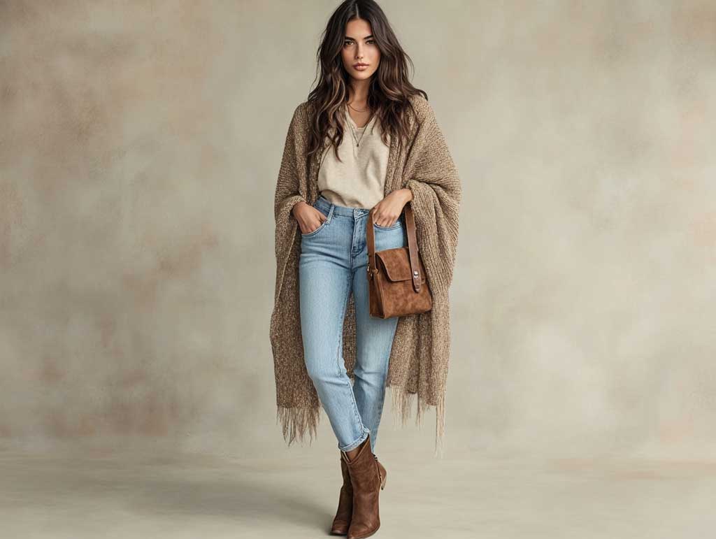 An open-front knit poncho offers a relaxed yet polished take on western outfit ideas, making it ideal for layering throughout the year. Its draped silhouette allows for easy movement, while its breathable fabric makes it versatile for various weather conditions.