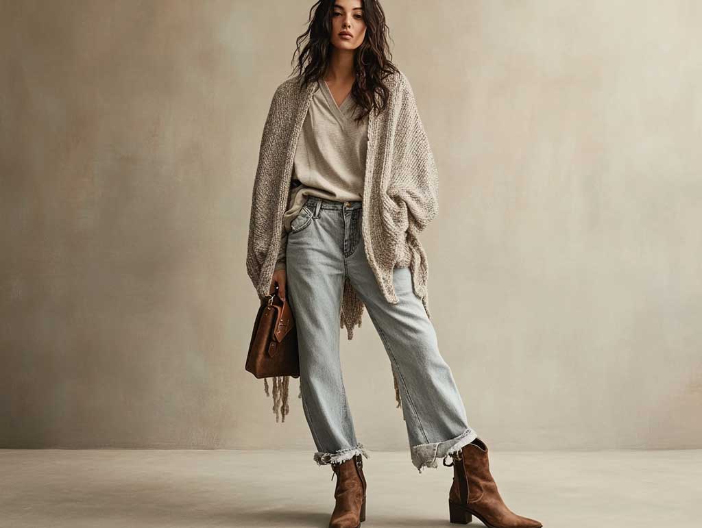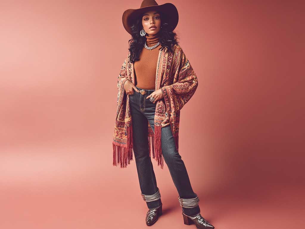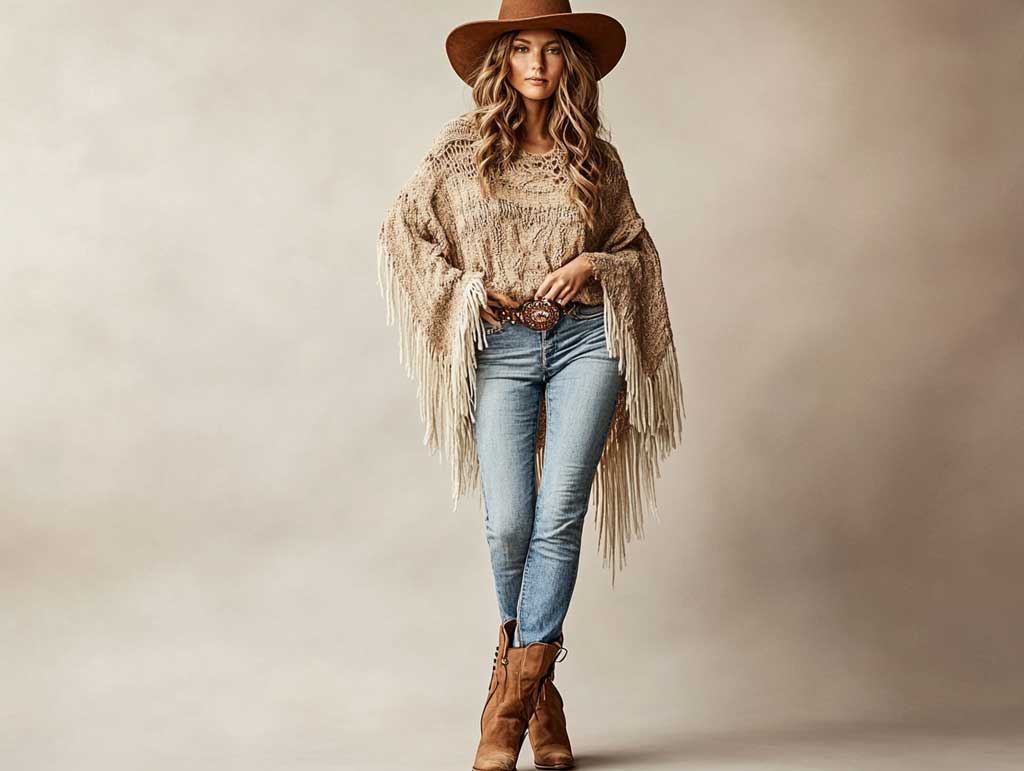 A fringed knit poncho adds movement and character to western outfit ideas, making it a must-have for those who love effortless layering. Its soft, textured fabric provides warmth, while the fringe detailing enhances the rustic aesthetic.