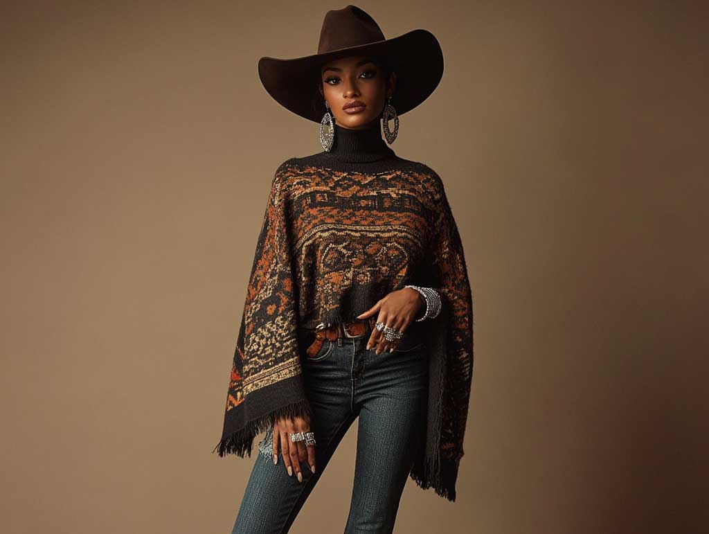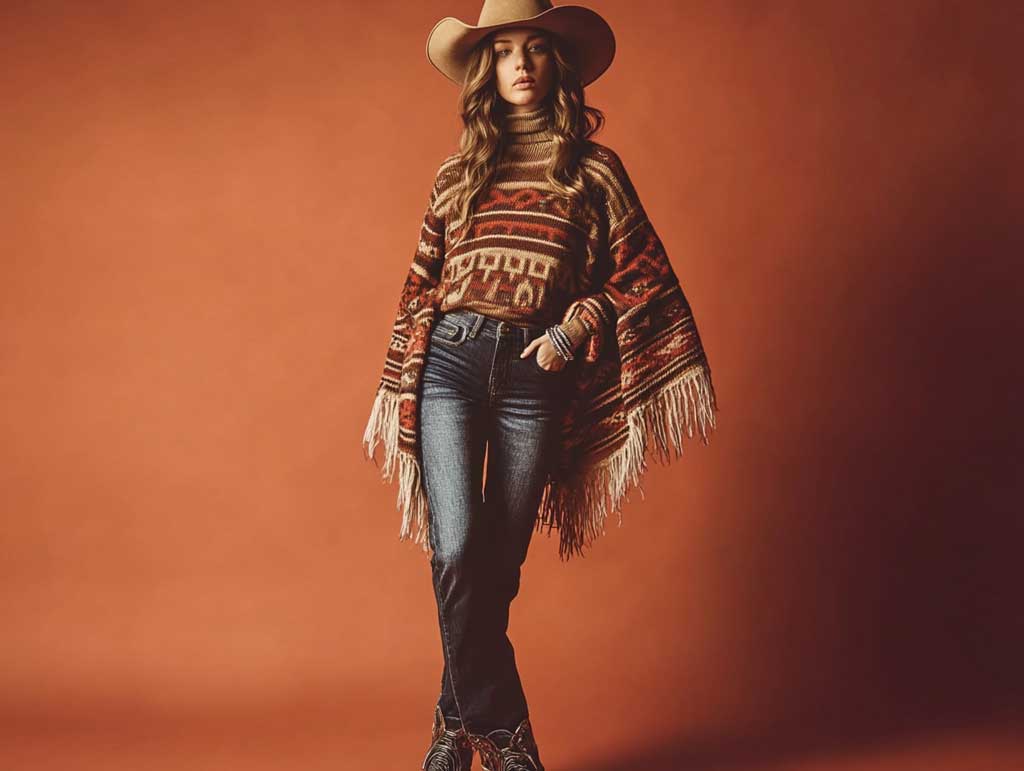 A patterned knit poncho is a standout piece that brings vibrancy and personality to western outfit ideas. Whether adorned with geometric designs or Southwestern motifs, the poncho creates a bold yet cozy statement.