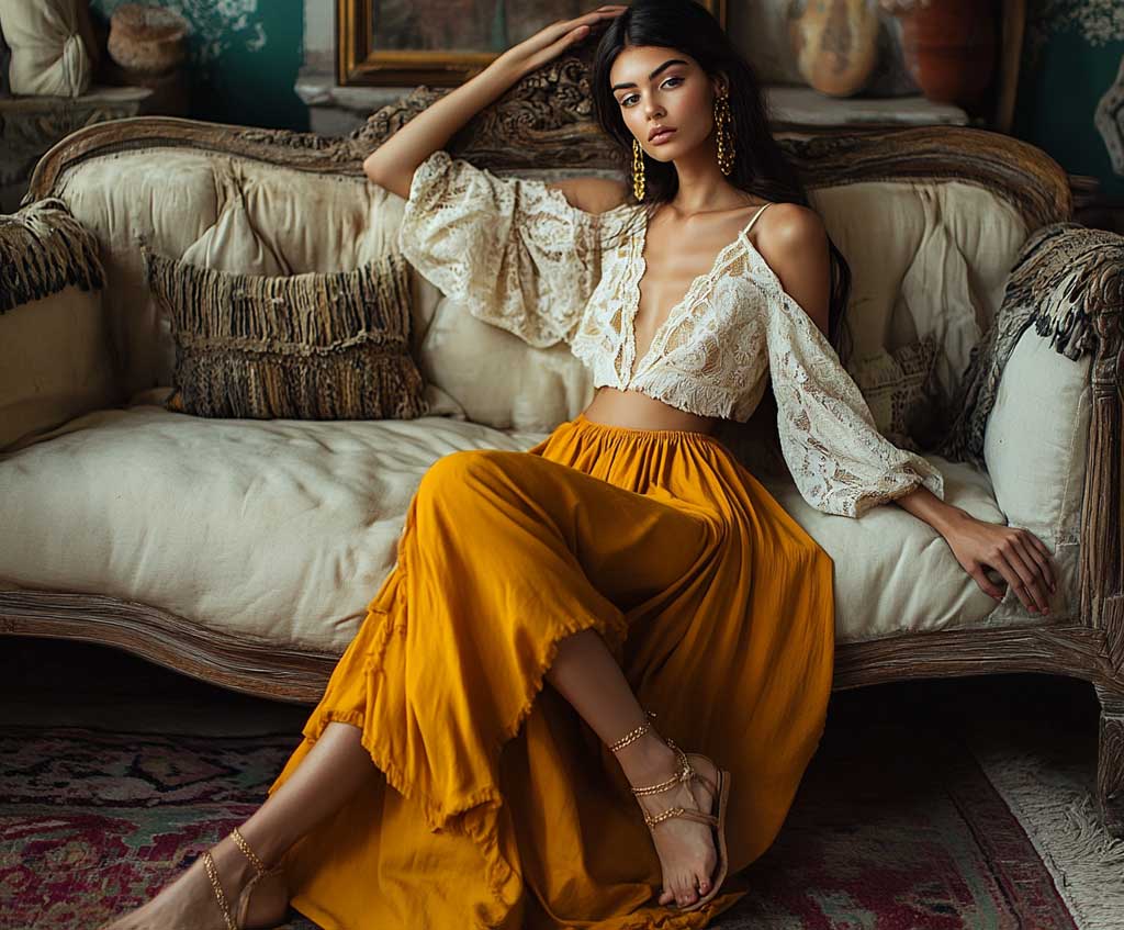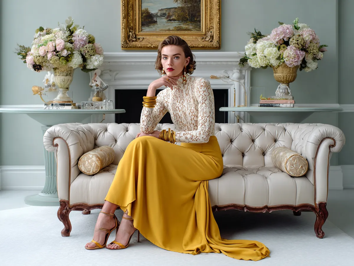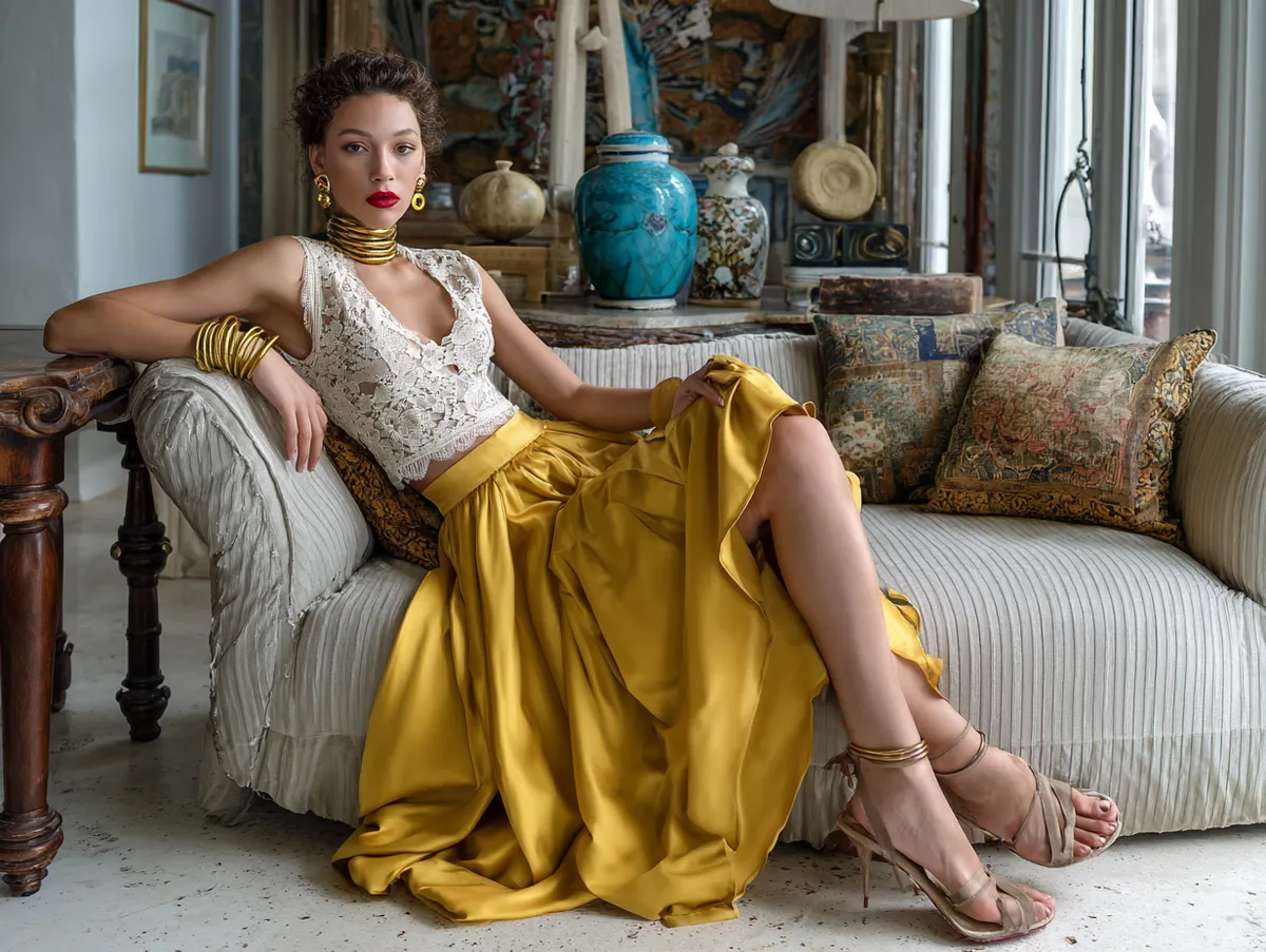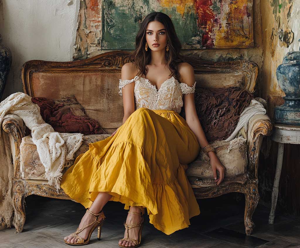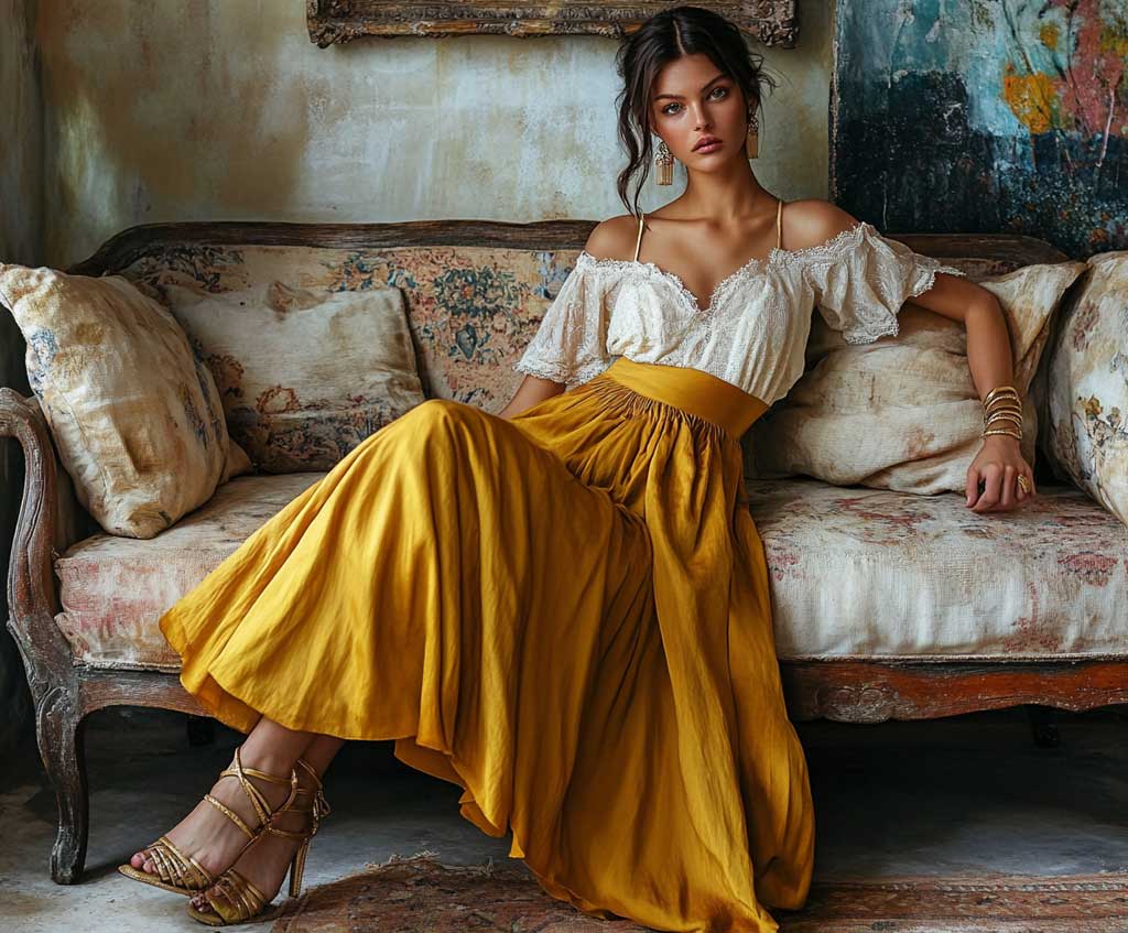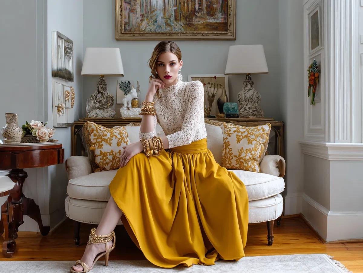The flowing mustard yellow skirt provides comfort and ease of movement, making it suitable for outdoor events like garden parties or brunches. The cream lace top, with its gentle patterns, brings a softness to the outfit. This combination highlights how long skirt outfit ideas can be both stylish and comfortable.