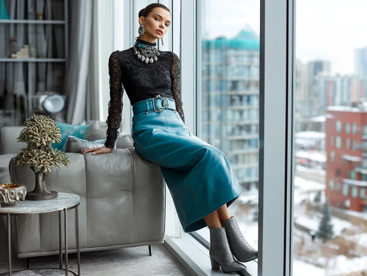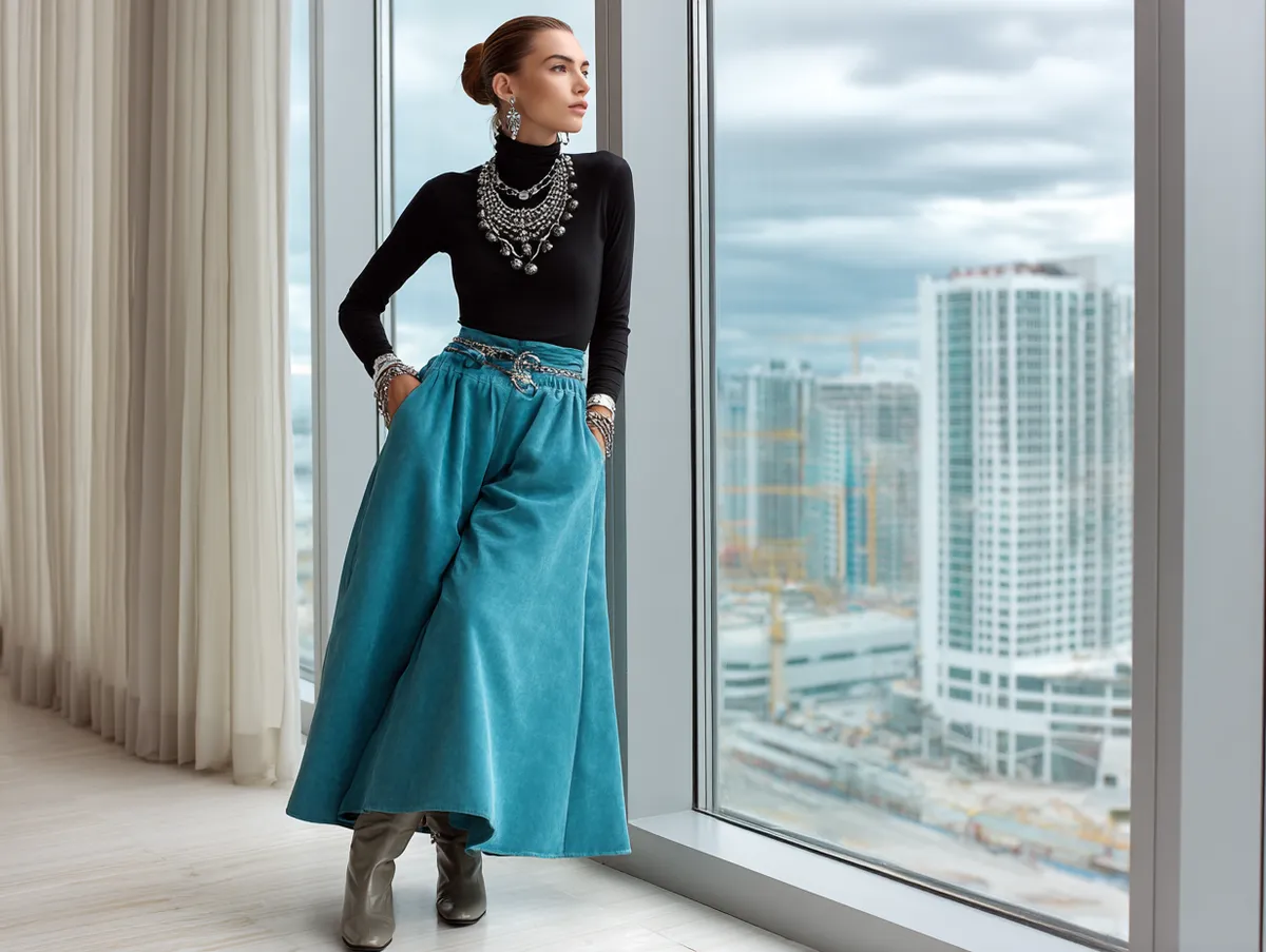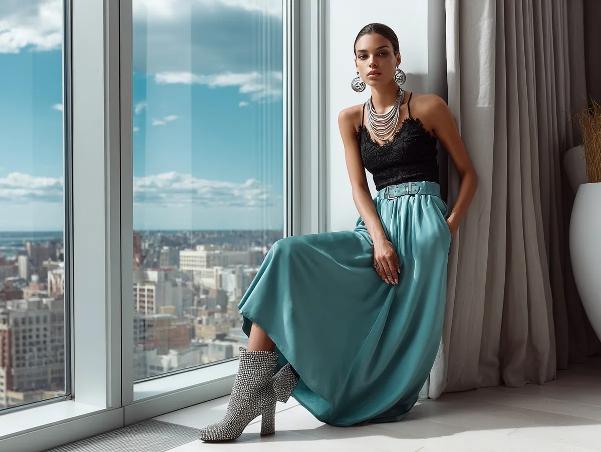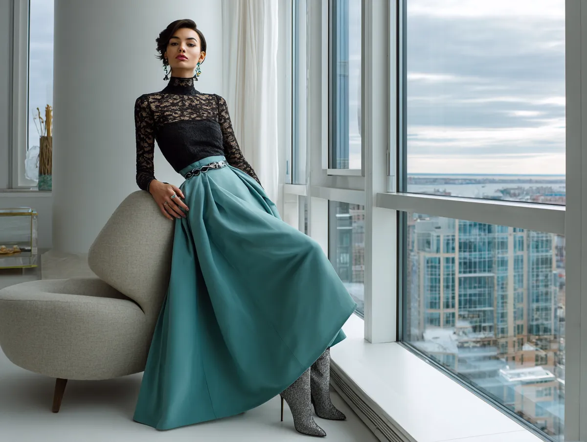 The fitted nature of the black lace top contrasts beautifully with the flowing teal skirt, creating a balanced silhouette. This outfit can be ideal for art gallery openings, dinner dates, or cocktail parties. It’s one of the long skirt outfit ideas that allows you to express individuality while maintaining a sense of elegance.