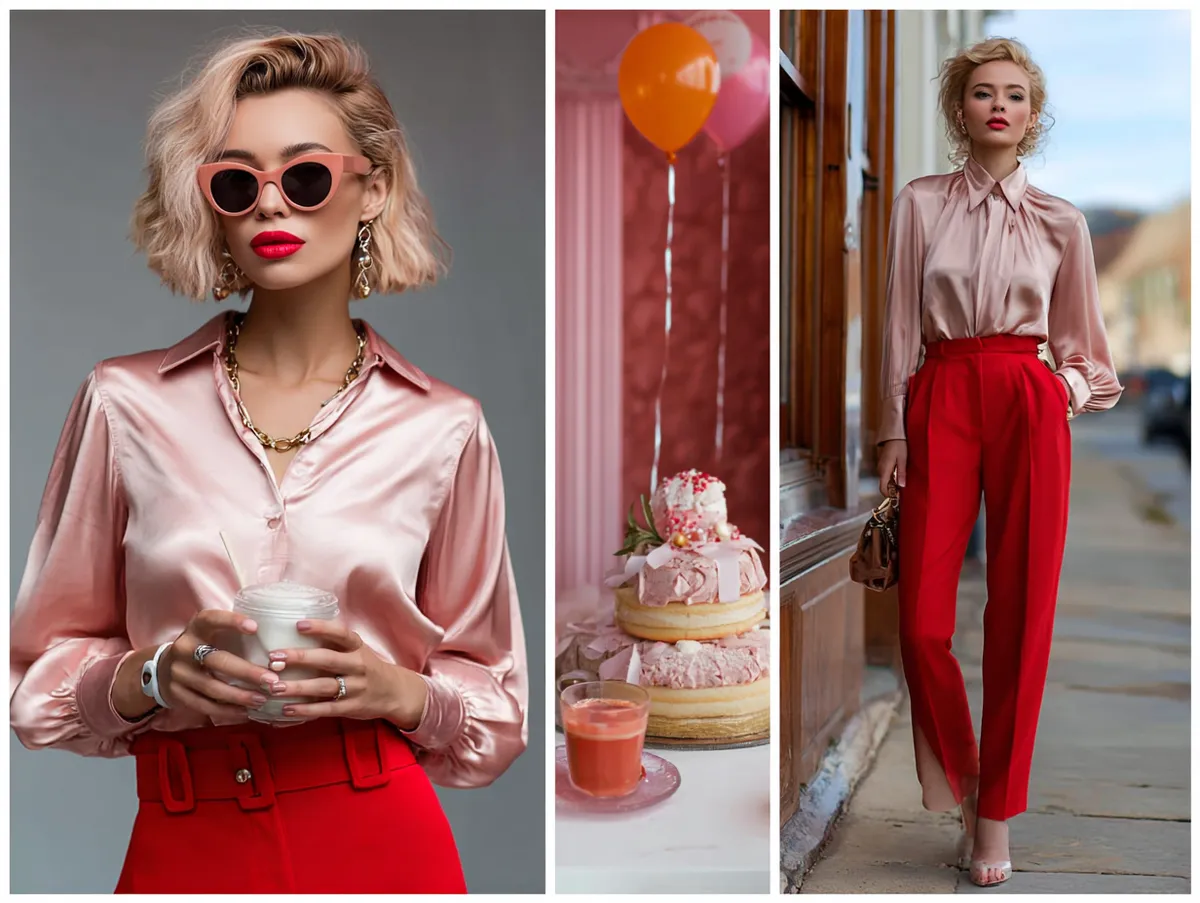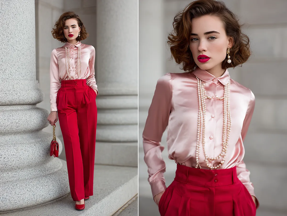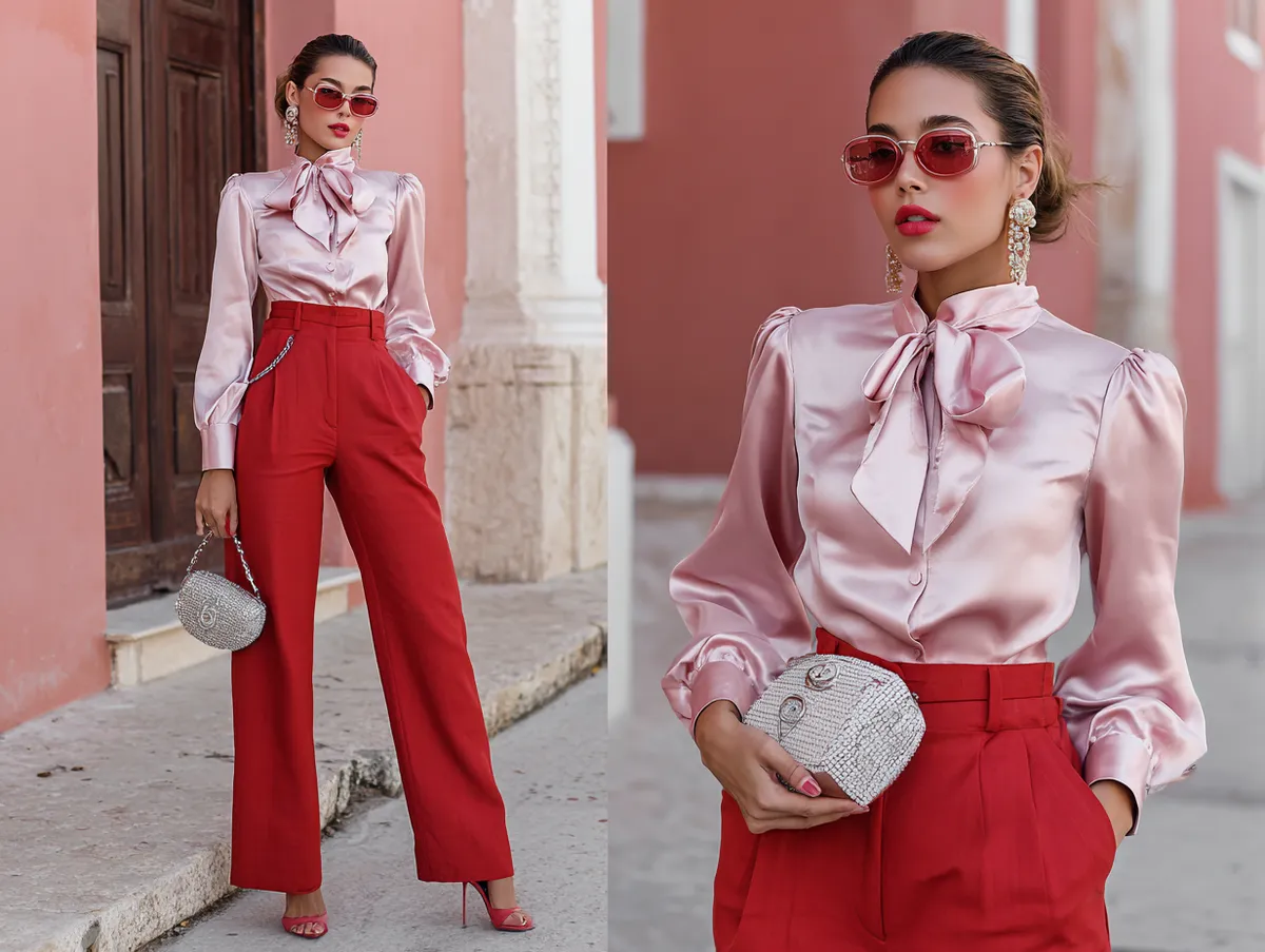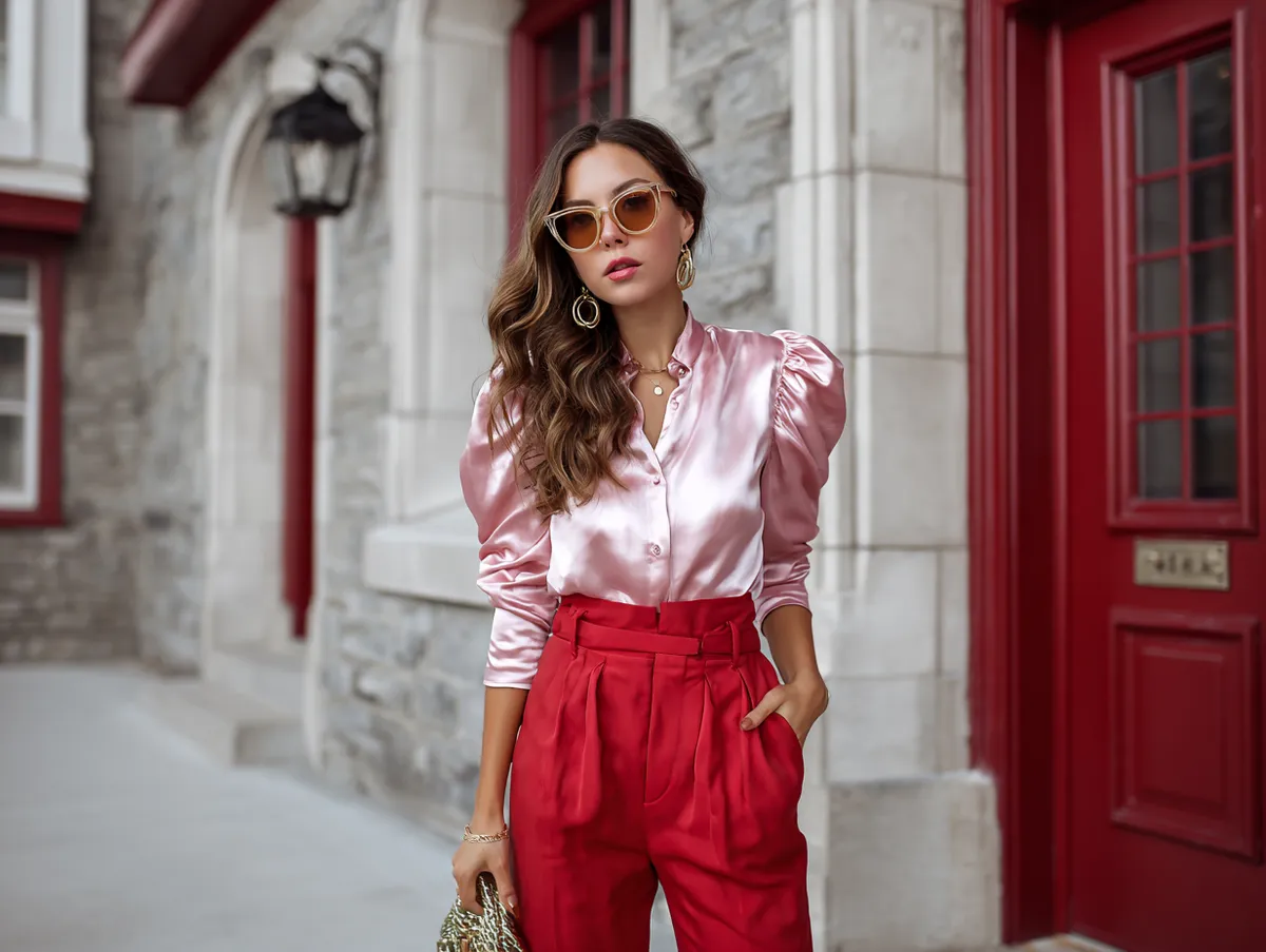 A pink satin blouse adds a touch of glamour to the outfit. The soft sheen of the satin material contrasts beautifully with the bold red pants, creating a dynamic look that feels festive without being over the top. Opt for a blouse with feminine details, such as a slight puff at the shoulders or delicate buttons down the front. The fluidity of the satin brings a sense of luxury to the outfit, making it ideal for special occasions.