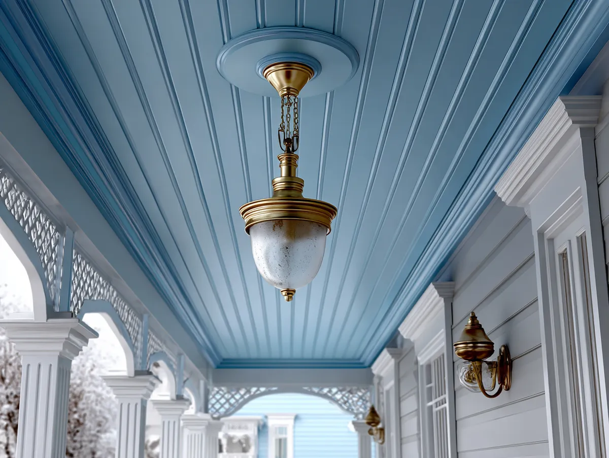 The Classic Southern Charm Porch Ceiling Design is a beautiful testament to traditional Southern architecture. A distinct feature of this design is the calming blue ceiling, commonly known as “haint blue,” a staple in Southern homes believed to ward off evil spirits and attract good luck.