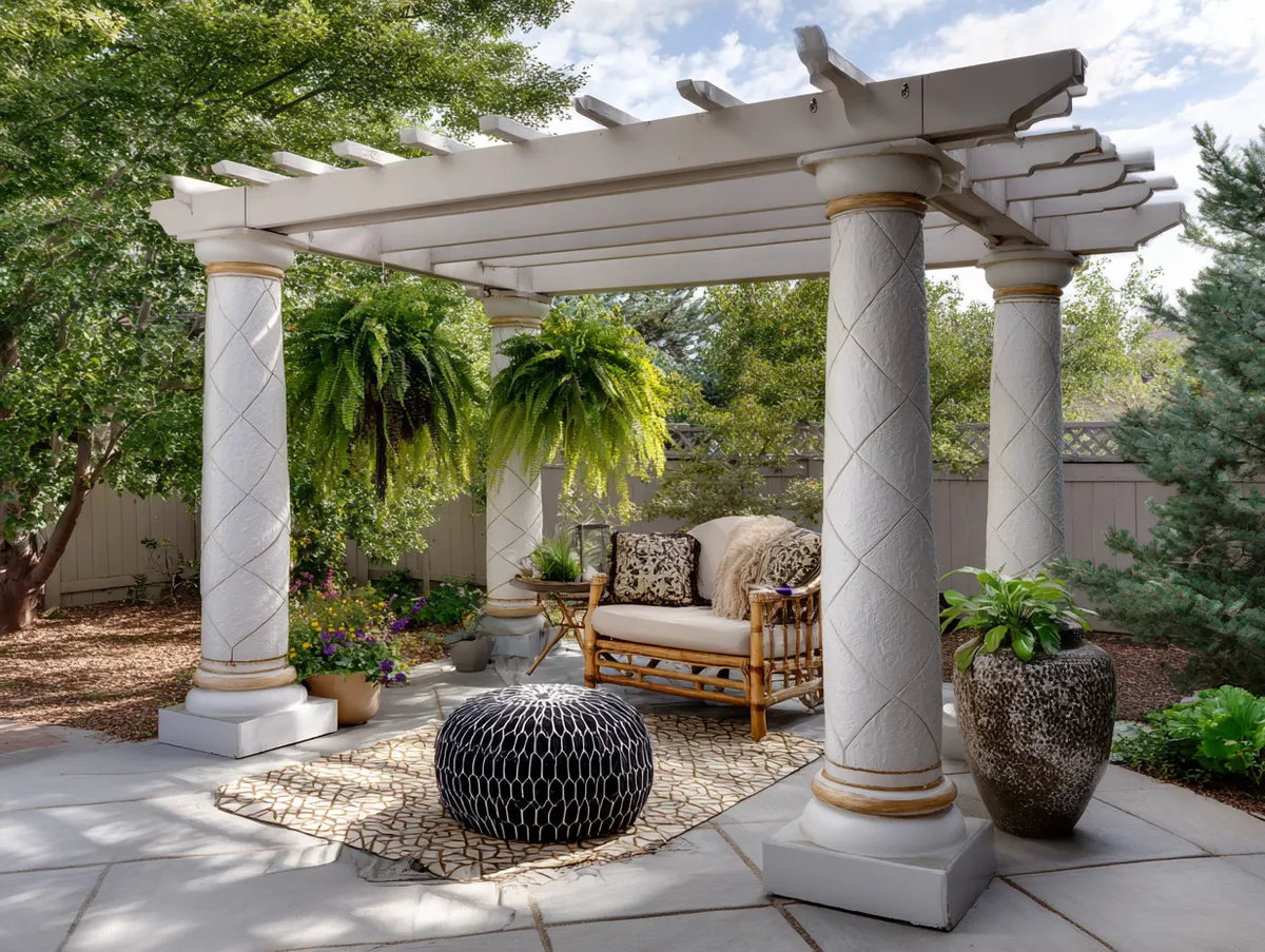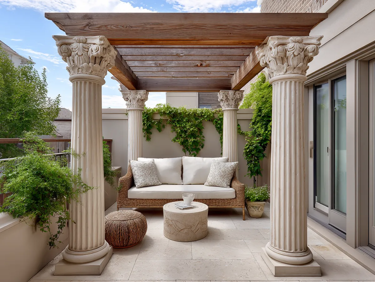 The image showcases a charming and cozy patio setting, the ambience of which is enhanced by a pergola that is supported by four distinct decorative outdoor columns. The columns not only serve as robust supports for the structure above but also add a touch of architectural finesse to the overall look and feel of the space. Their stone-like texture and earthy color palette seamlessly blend in with the patio’s surrounding environment, embodying the essence of outdoor living.
