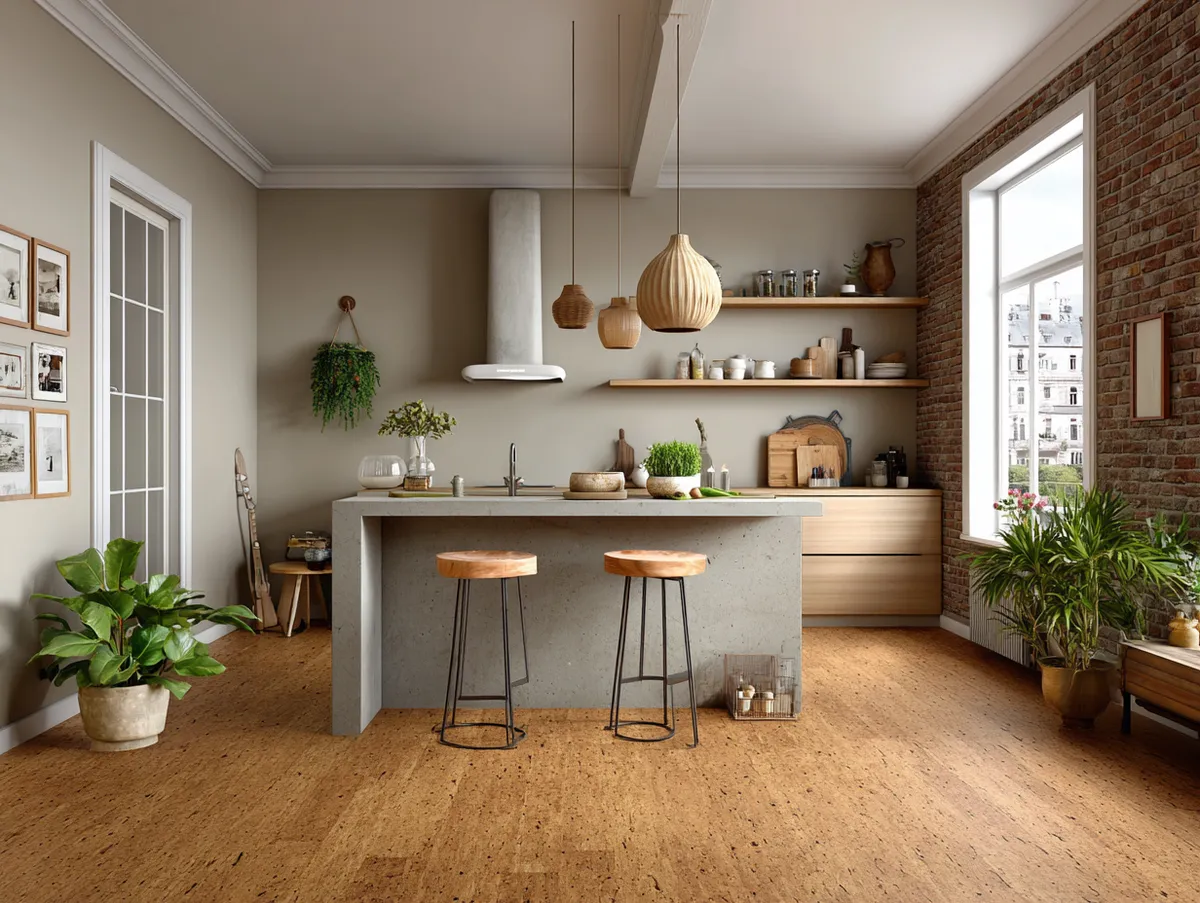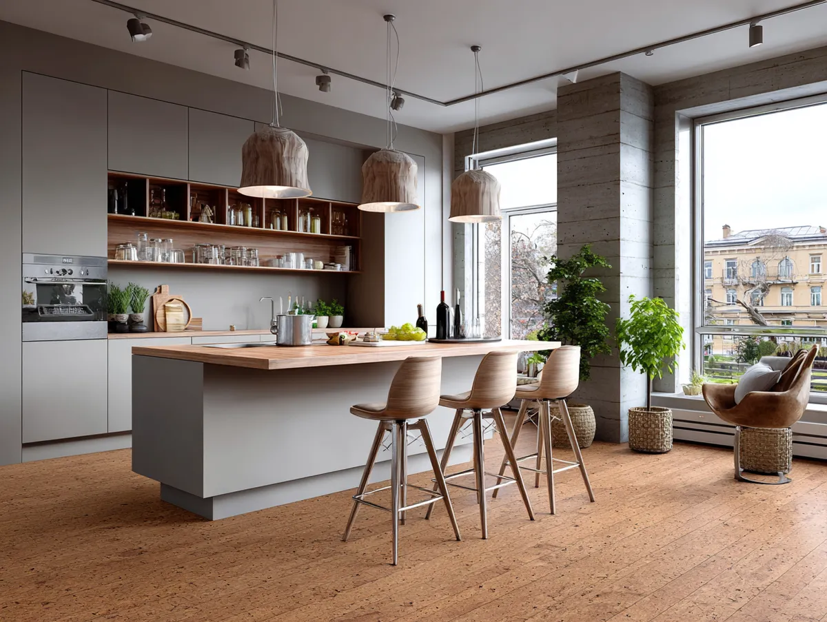 Our exploration of kitchen flooring options continues with cork, a material known for its warmth and comfort. The image presents a modern kitchen with cork flooring, highlighting its natural beauty and comfort.